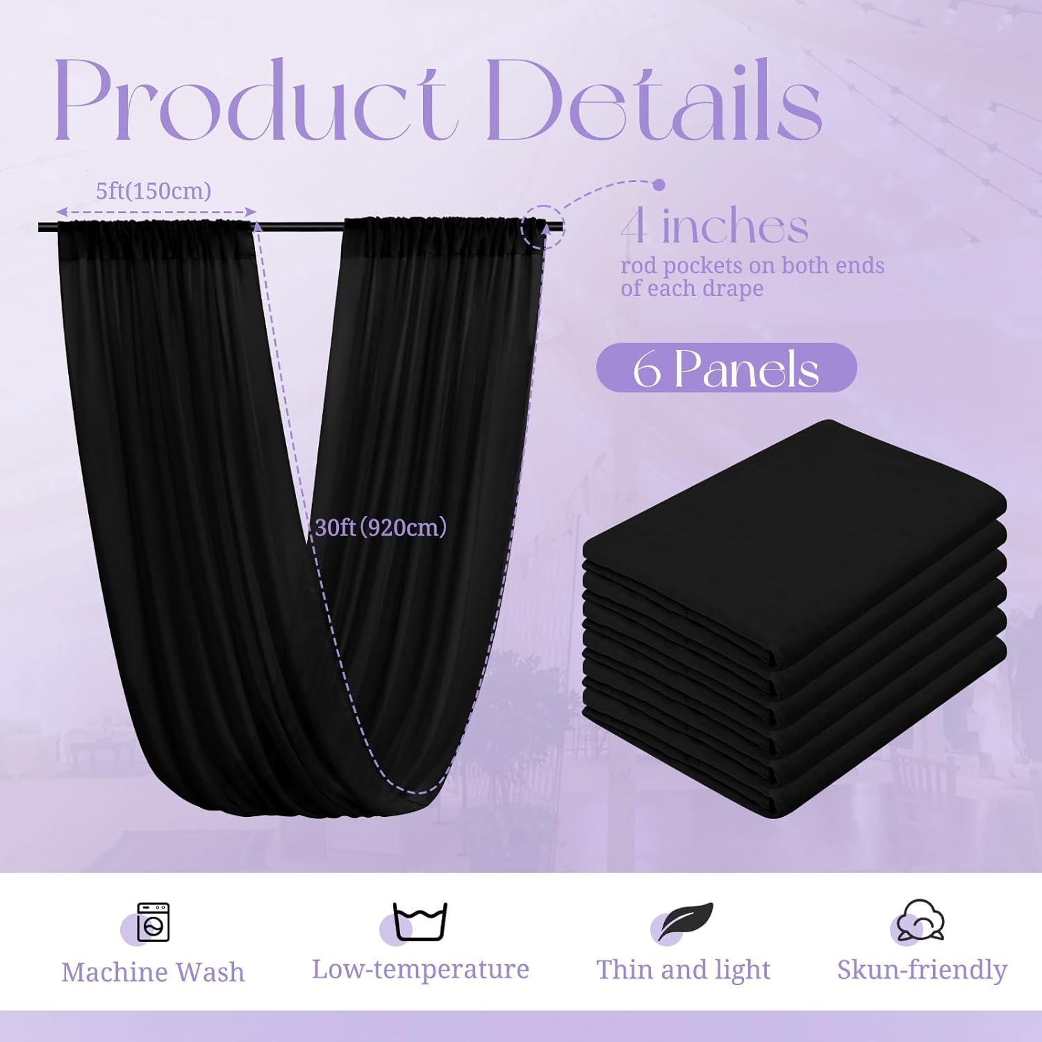 6 Panels Black Ceiling Drapes for Wedding, 5ftx30ft Ceiling Drapes Cheesecloth Sheer Fabric Curtain Wedding Arch Draping Fabric Romantic Ceilings Decorations for Weddings Party Ceremony Stage