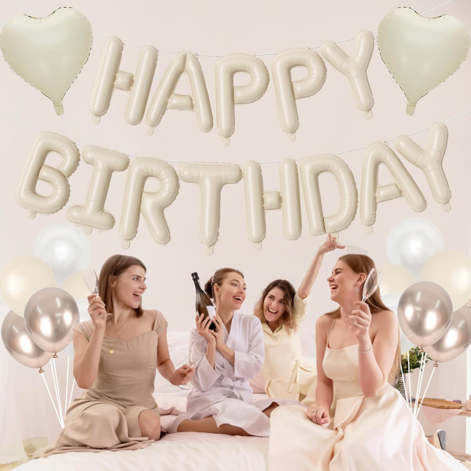 - Complete Balloon Set: Includes one set 16 inch cream happy birthday foil balloon, 2 x 18 inch cream heart foil balloons, 2 x 12 inch metallic champagne gold balloons, 2 x 12 inch sand white balloons, 2 x 12 inch pearl white balloons, ribbon, glue dots and straws. Bundle everything together to save shopping time and create party-ready decorations in no time.