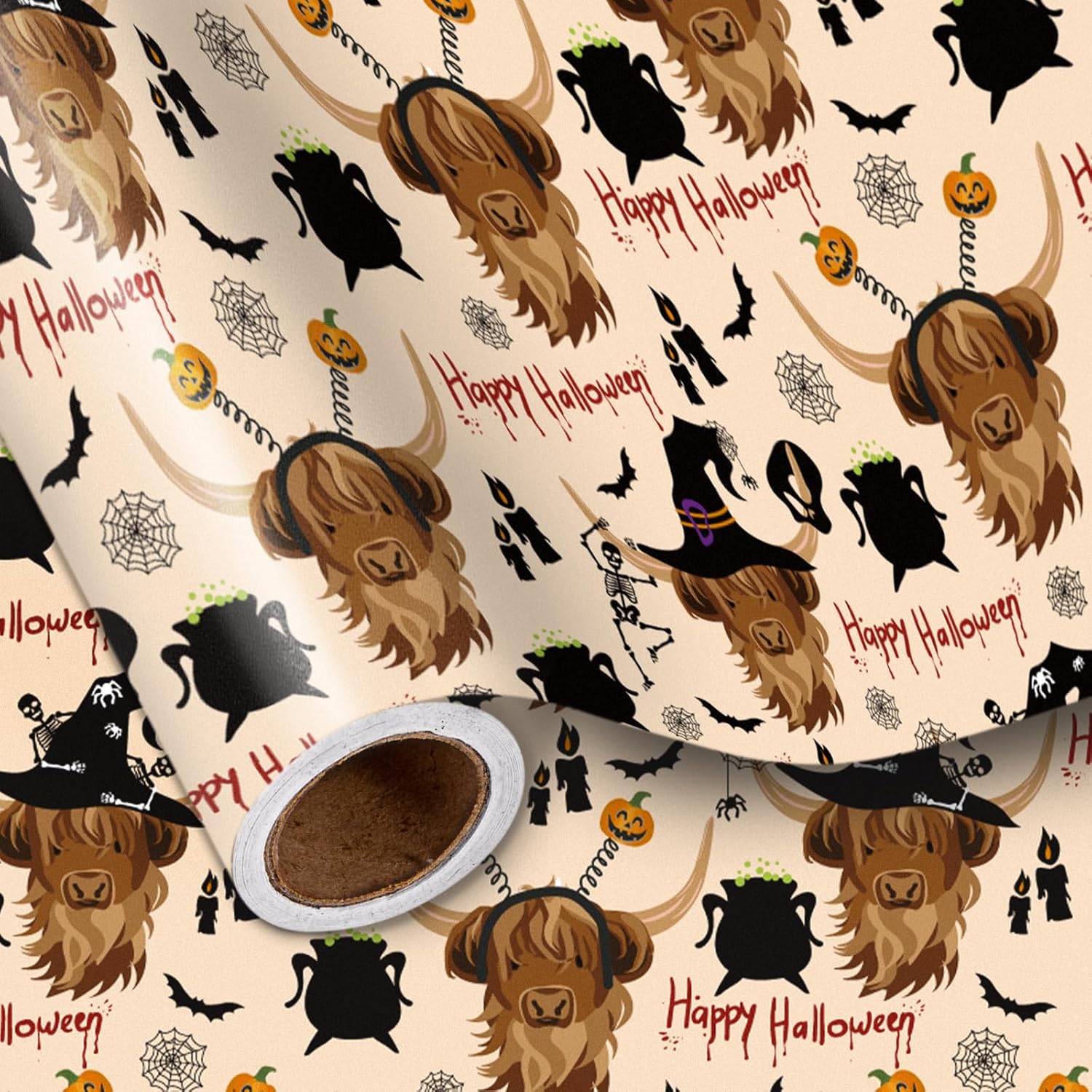 - Cute & Spooky Halloween Design: Features highland cows dressed for Halloween with pumpkin headbands, witch hats, skeletons, bats, cauldrons, and cobwebs.