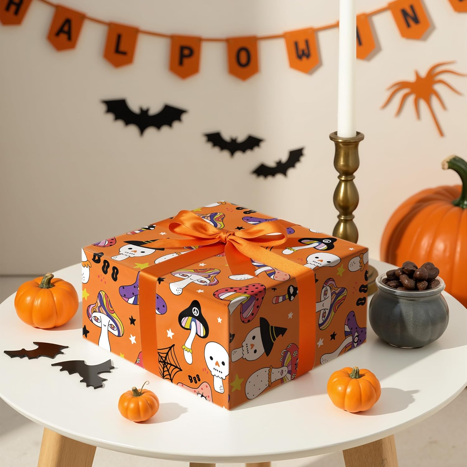 - Halloween Creepy Mushroom Wrapping Paper: Features colorful mushrooms with eyes, skull heads, peace signs, witch hats, spider webs, stars, and “BOO” text on a bold orange background—perfect for a spooky and surreal vibe.