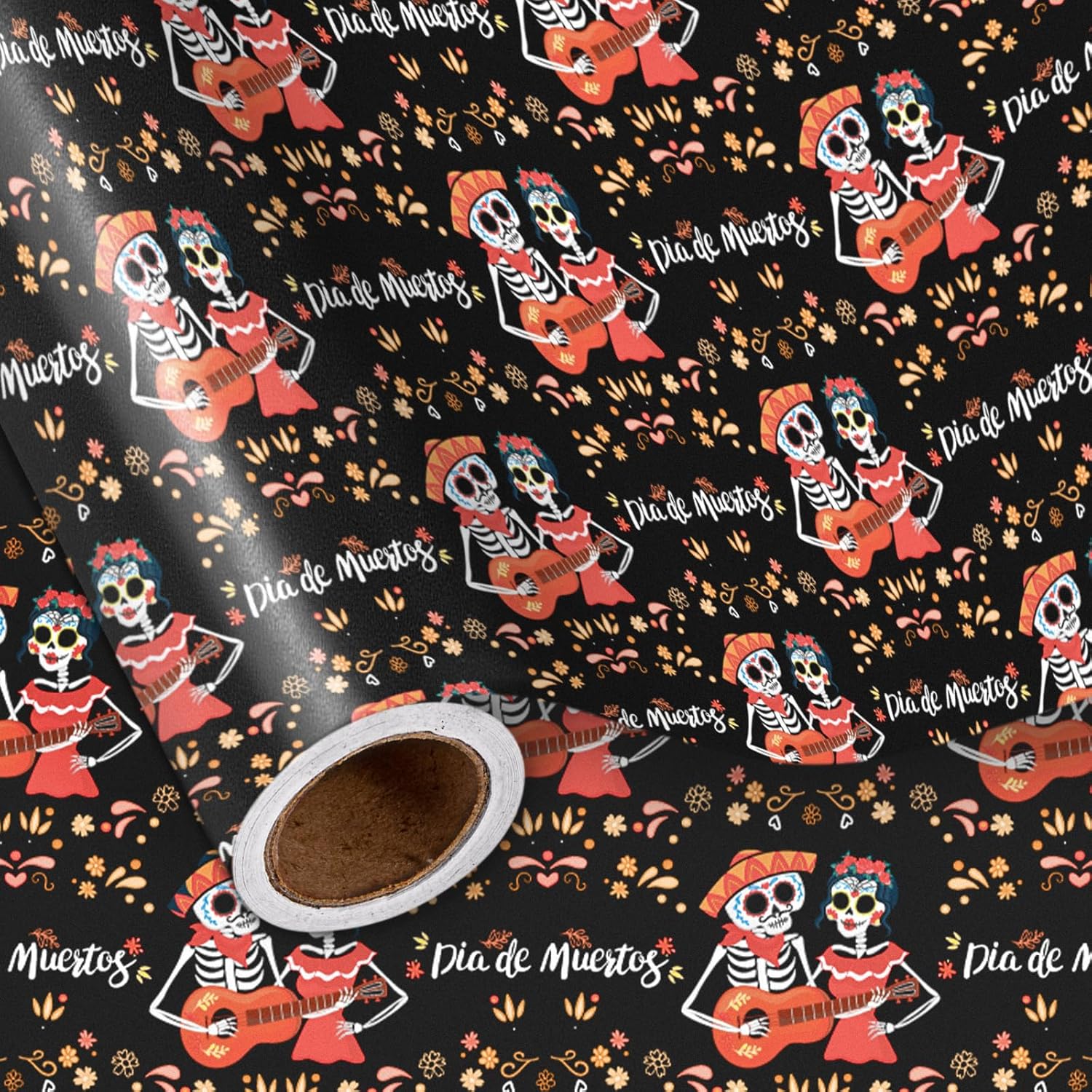LeZakaa Day of the Dead Wrapping Paper Roll, Skulls, Día de Muertos Skeleton Couple Playing Guitar Design, for Party Celebrations, Romance, Mini Roll 17 in x 16.4 Ft