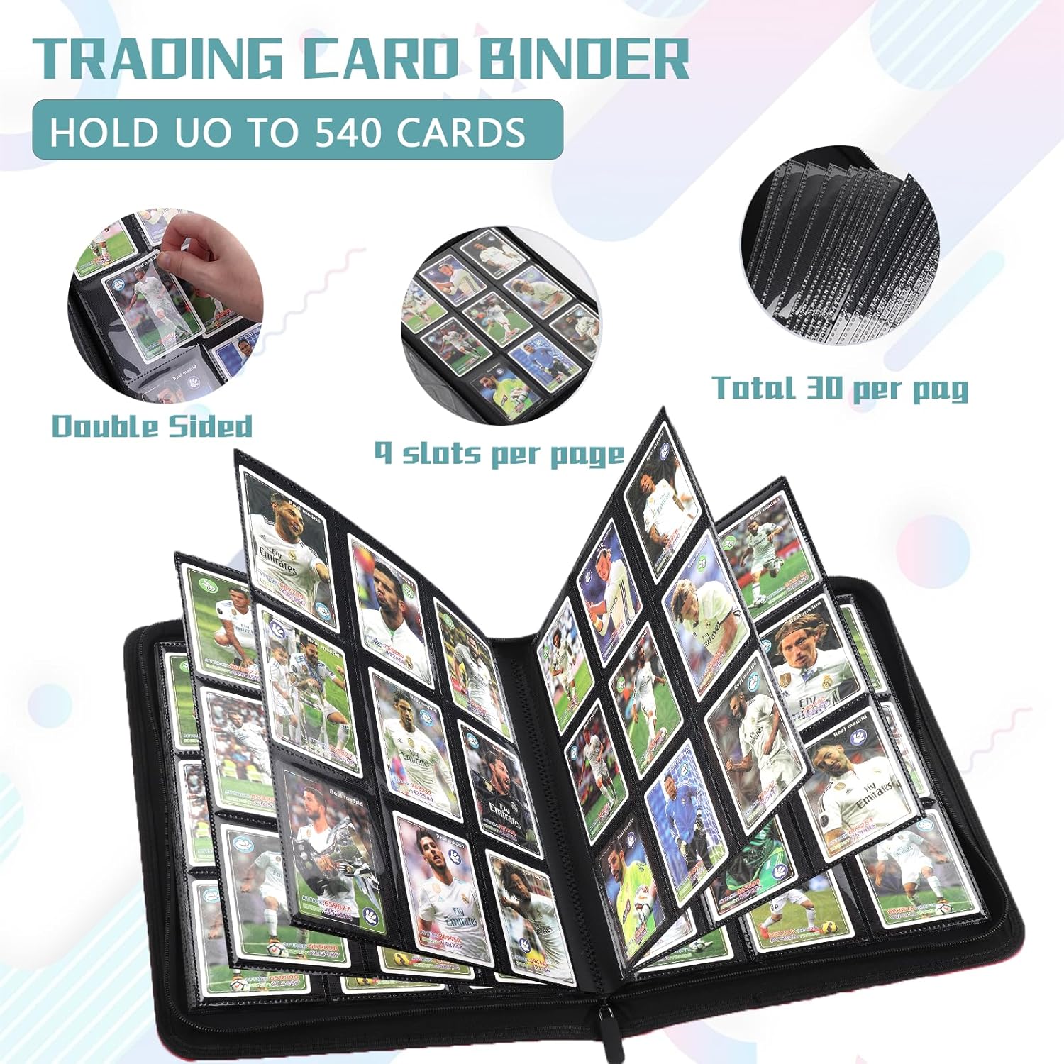 - LARGE CAPACITY CARD STORAGE:Smooth zippered card holder with 9 pockets per page,30 double sided pages hold up to 540 cards,providing plenty of space for card collectors and players to organize their cards
