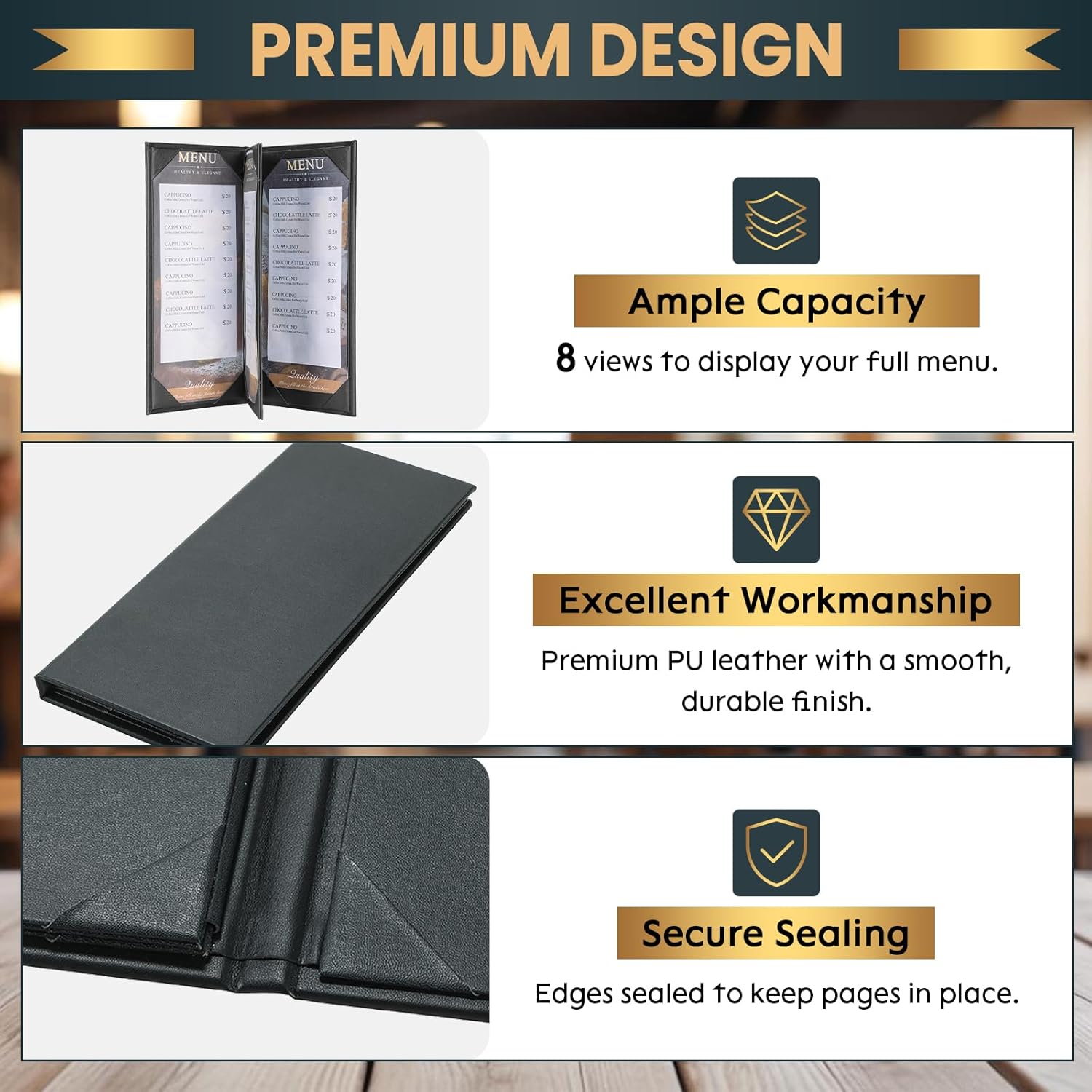 • Elegant Appearance: The overall design of the classical style menu rack is classic, which can improve the class and taste of the restaurant and be more attractive to customers. This leather menu cover has sealed edges so there is no need to worry about menu pages falling out.