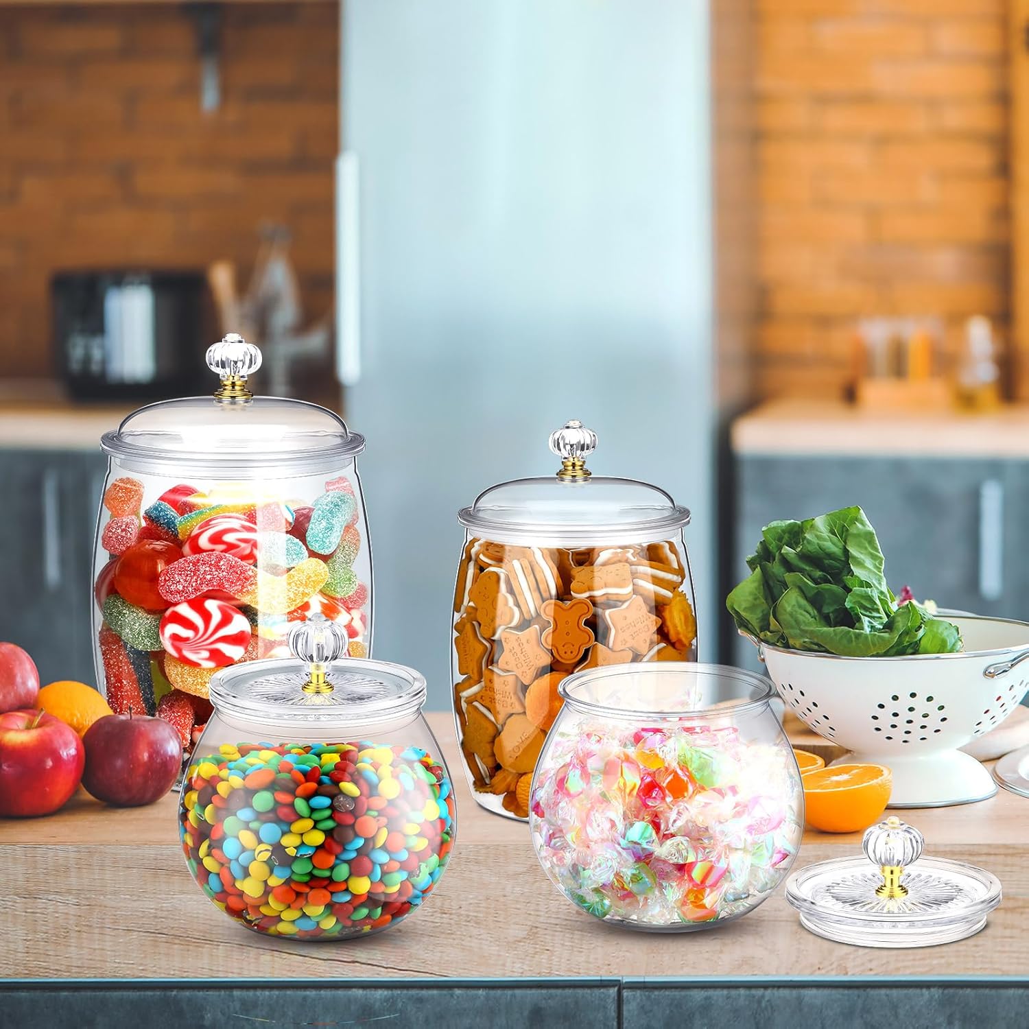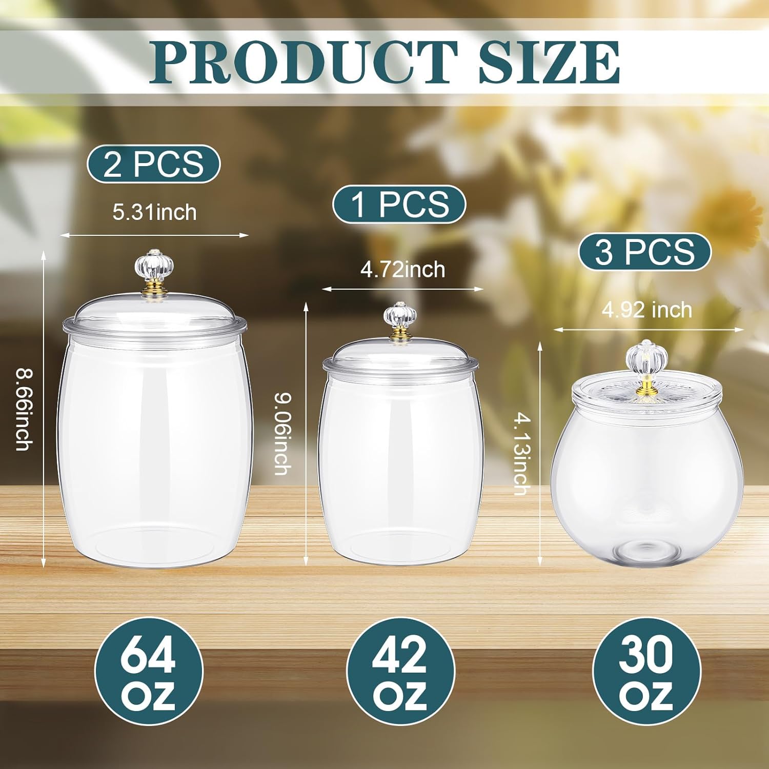 - Size and Capacity: the brilliant design of these plastic candy jars boasts a size of about 64 oz, 42 oz, 30 oz in capacity; This space saving feature enables you to store up to kinds of your favorite sweets or snacks, fitting well on your kitchen counter or dining table