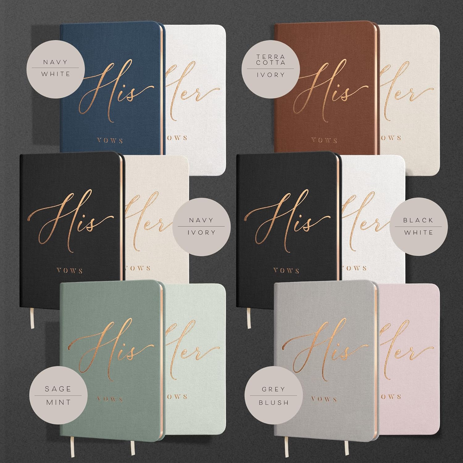 - PREMIUM LINEN COVER & COLOR COMBOS: Each set includes two his her vows book with a sophisticated linen-textured cover, available in six elegant color combinations: Terracotta & Ivory, Black & Ivory, Navy & White, Sage & Mint, Grey & Blush, Black & White. Ideal wedding accessories for your special day!