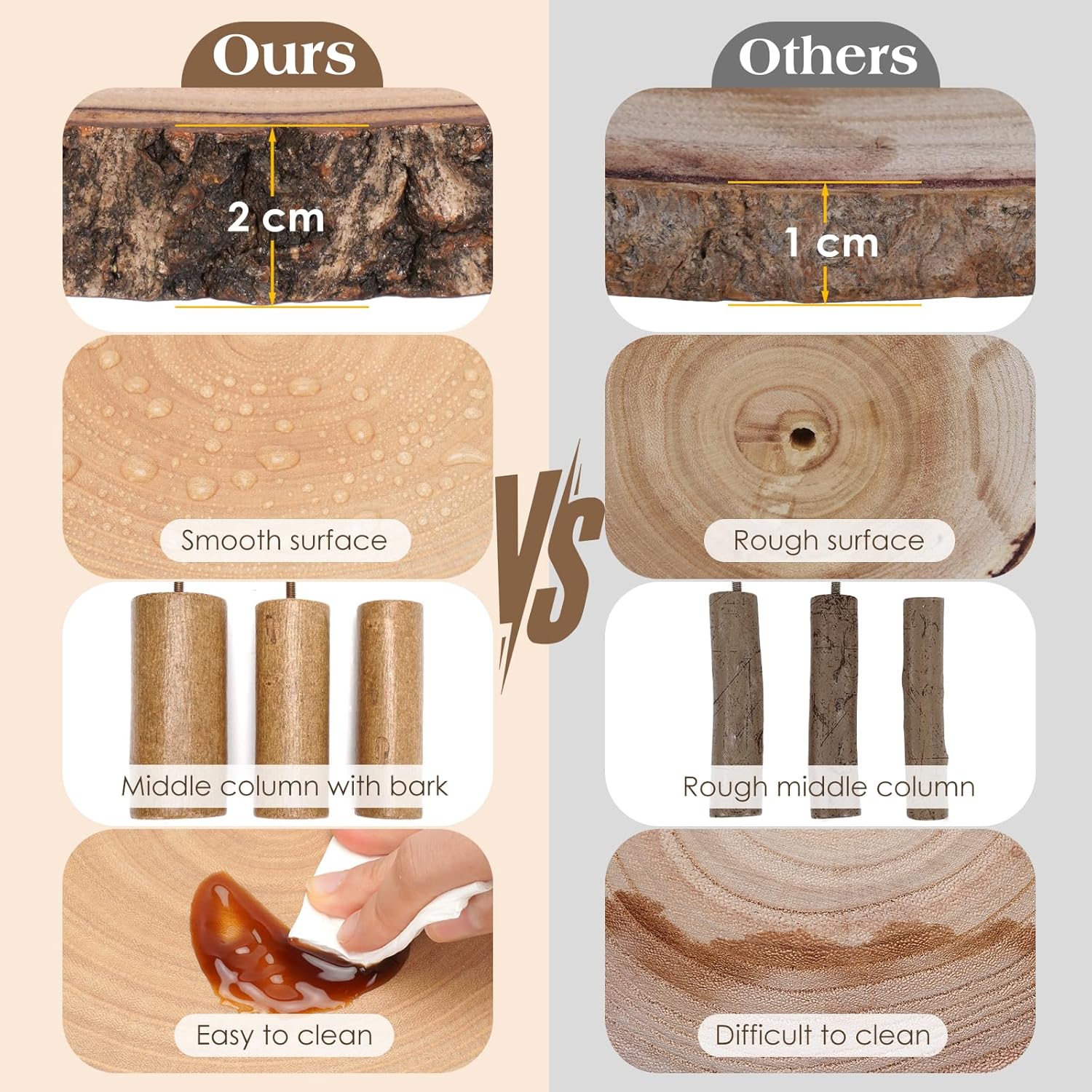 - ark covered center pole: The cake stand is equipped with a thickened bark covered center pole to ensure sturdiness and stability. The center pole can easily link the wood pieces and can be adjusted to customize the number of layers to suit your display needs.
