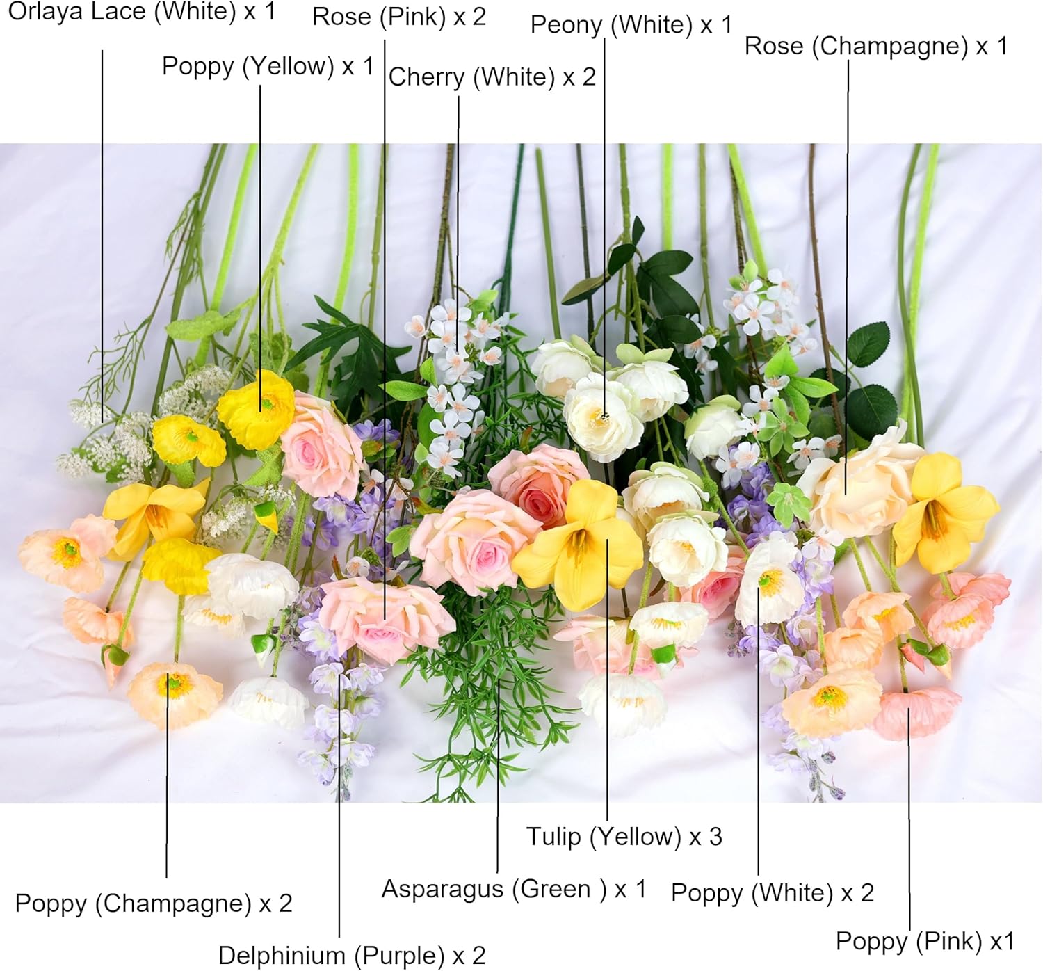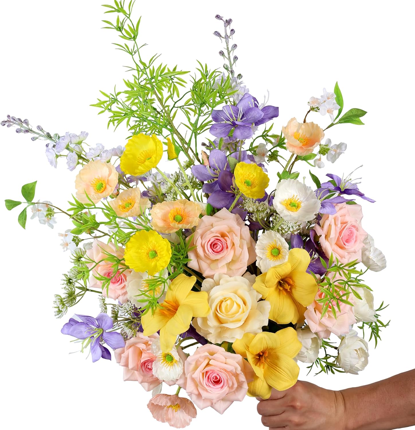 - GORGEOUS MIXTURE: A combo box packs a variety of flowers/greenery and colors as elegant or romantic themed wedding or home decor. We carefully pick and pack the floral bouquet with total of 22 silk flowers and accessories in beautiful & soft color range, such as pink, yellow, violet, white and cream white, including roses, delphinium, tulip, poppy, etc. Vibrant color and lifelike touch make it looking so realistic.