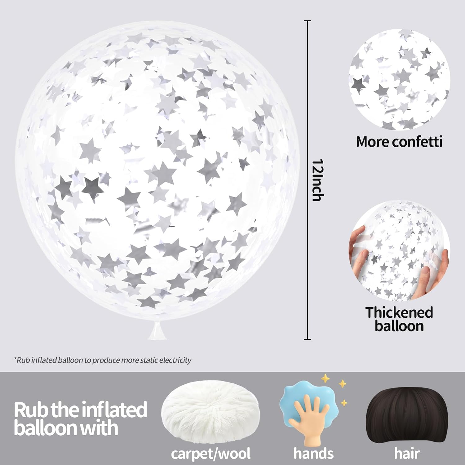 VHUWE 25 Pcs Silver Star Confetti Balloons, 12 Inch Clear Latex Balloon with Confetti Inside for Birthday Party Baby Shower Graduation Engagement Bridal Shower Decorations Supplies - Star Confetti