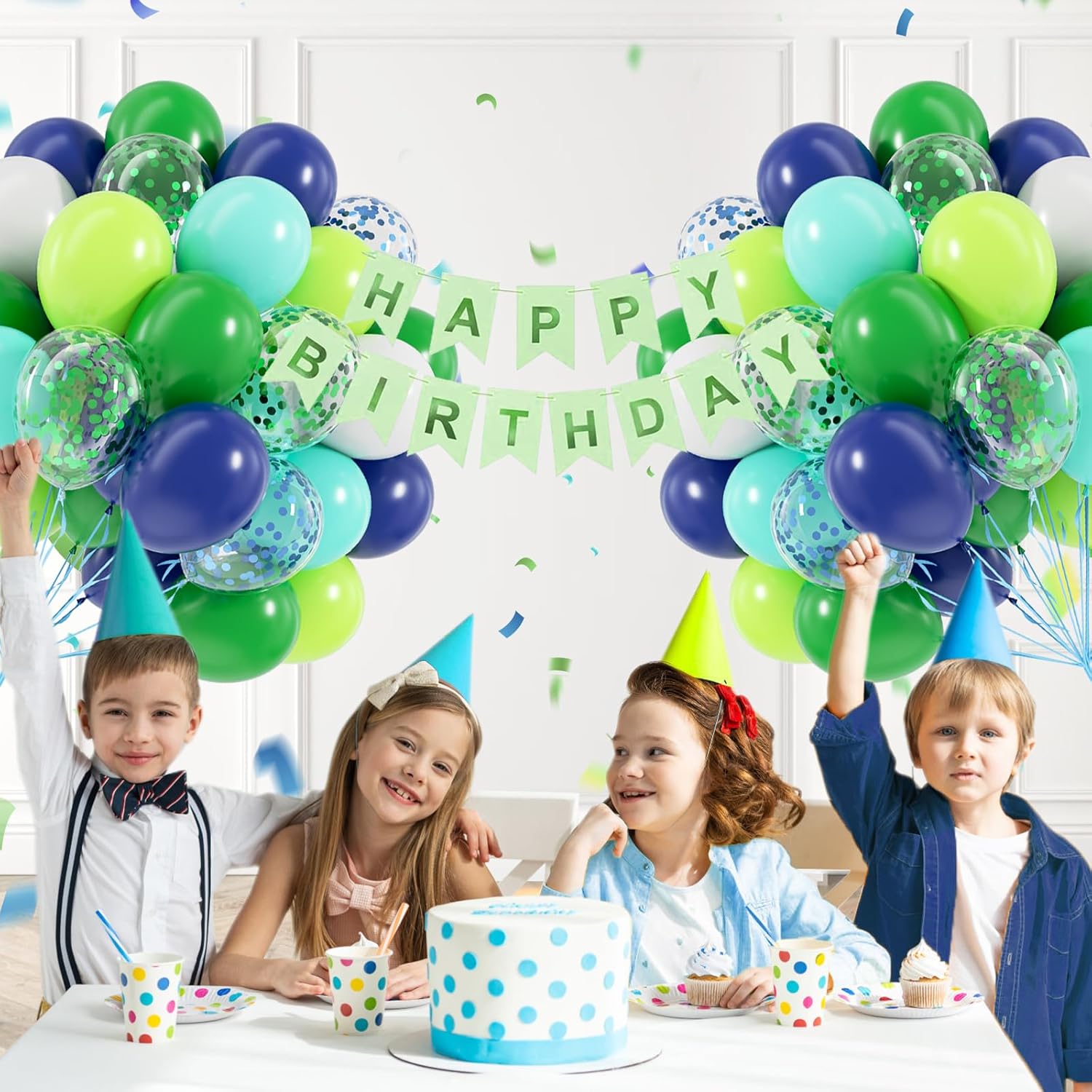 - What You Will Get: The package includes 60pcs 12inch navy blue balloonsx10, 12inch green balloonsx10, 12inch white balloonsx10, 12inch lime green balloonsx10, 12inch teal balloonsx10, 12inch green confetti balloonsx5, 12inch blue confetti balloons x5, glue dotsx20, blue ribbonx1