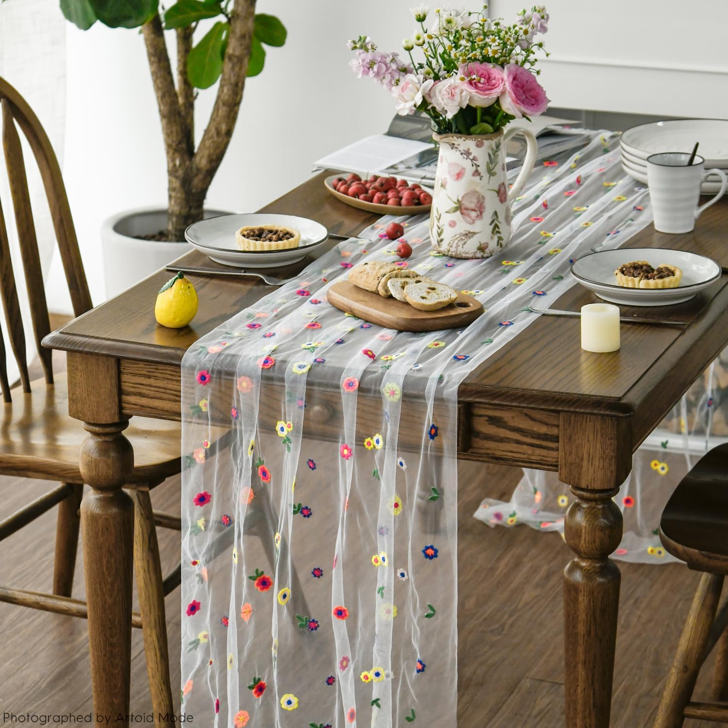 Artoid Mode Embroidery Daisy Gauze Table Runner 120 Inch 10FT, Seasonal Sheer Kitchen Dining Holiday Wedding Birthday Table Decor for Home Party