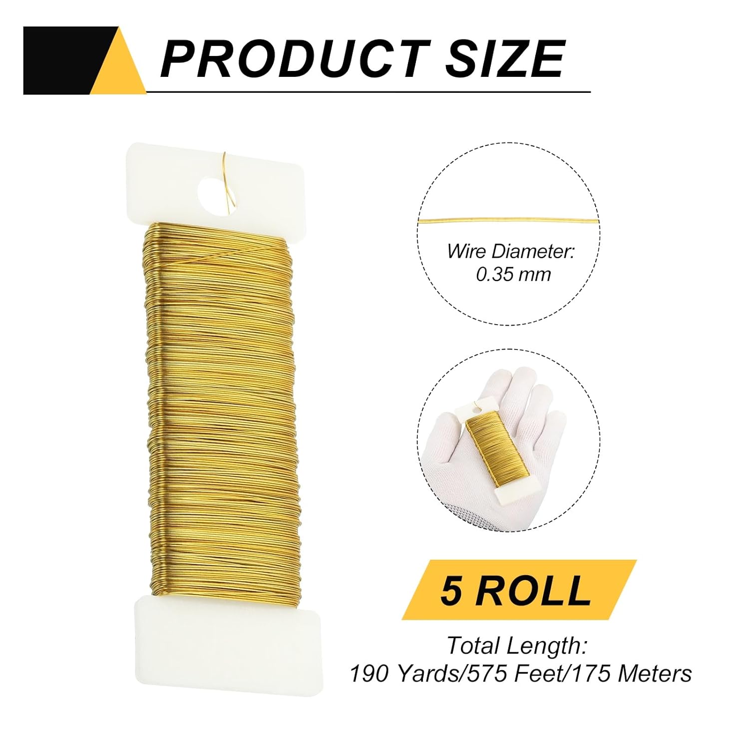 - Color: Gold Tone; Material: Aluminum; Total Length: 190 Yards/575 Feet/175 Meters; Diameter: 0.35mm/27 Gauge; In the package of: 5 Roll Metal Floral Wire (38 Yards/ Roll)