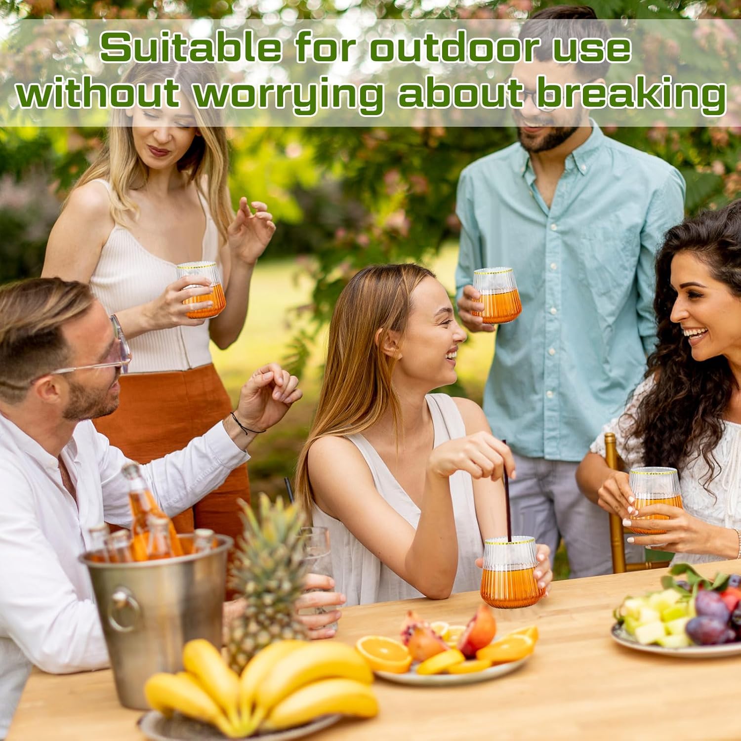 Suclain Plastic Wine Glasses Ribbed Stemless Wine Glasses 14oz Vertical Design Unbreakable Cups for Outdoor Indoor Vintage Elegant Champagne Whiskey Cups for Party Wedding(Clear, Gold,50 Pcs)
