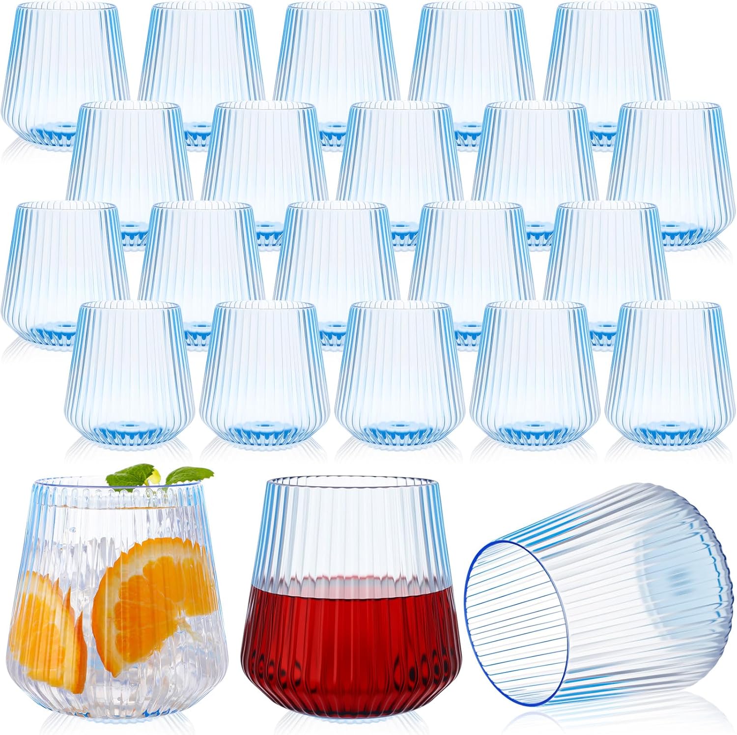 Suclain Plastic Wine Glasses Ribbed Stemless Wine Glasses 14oz Vertical Design Unbreakable Cups for Outdoor Indoor Vintage Elegant Champagne Whiskey Cups for Party Wedding (Blue,20 Pcs)