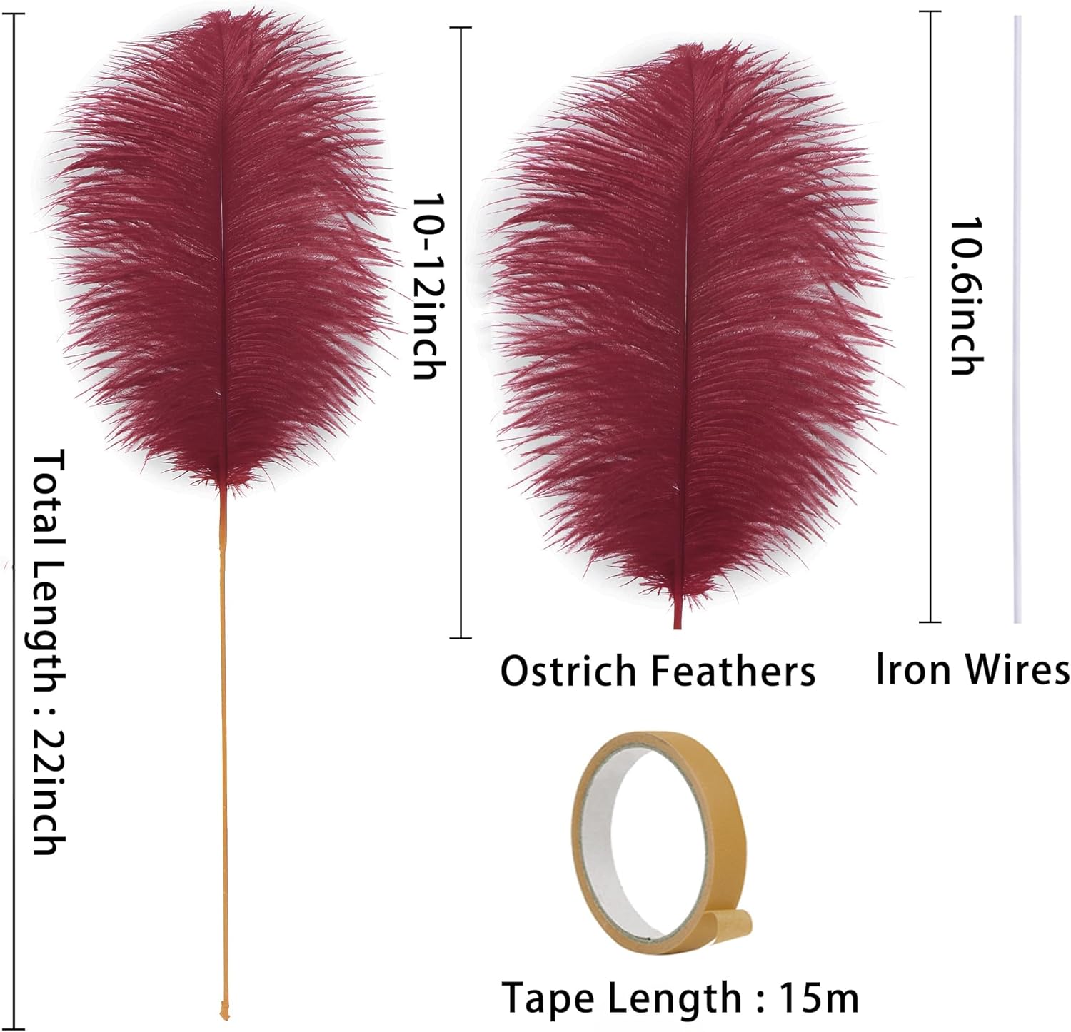 - 22inch Ostrich Feathrs Kit: 20pcs 10-12 inches burgundy ostrich feathers, 20 pcs 10 inches long iron wire, and a 15m tape in the same color with the feather. Rich set content to meet your decoration and use needs