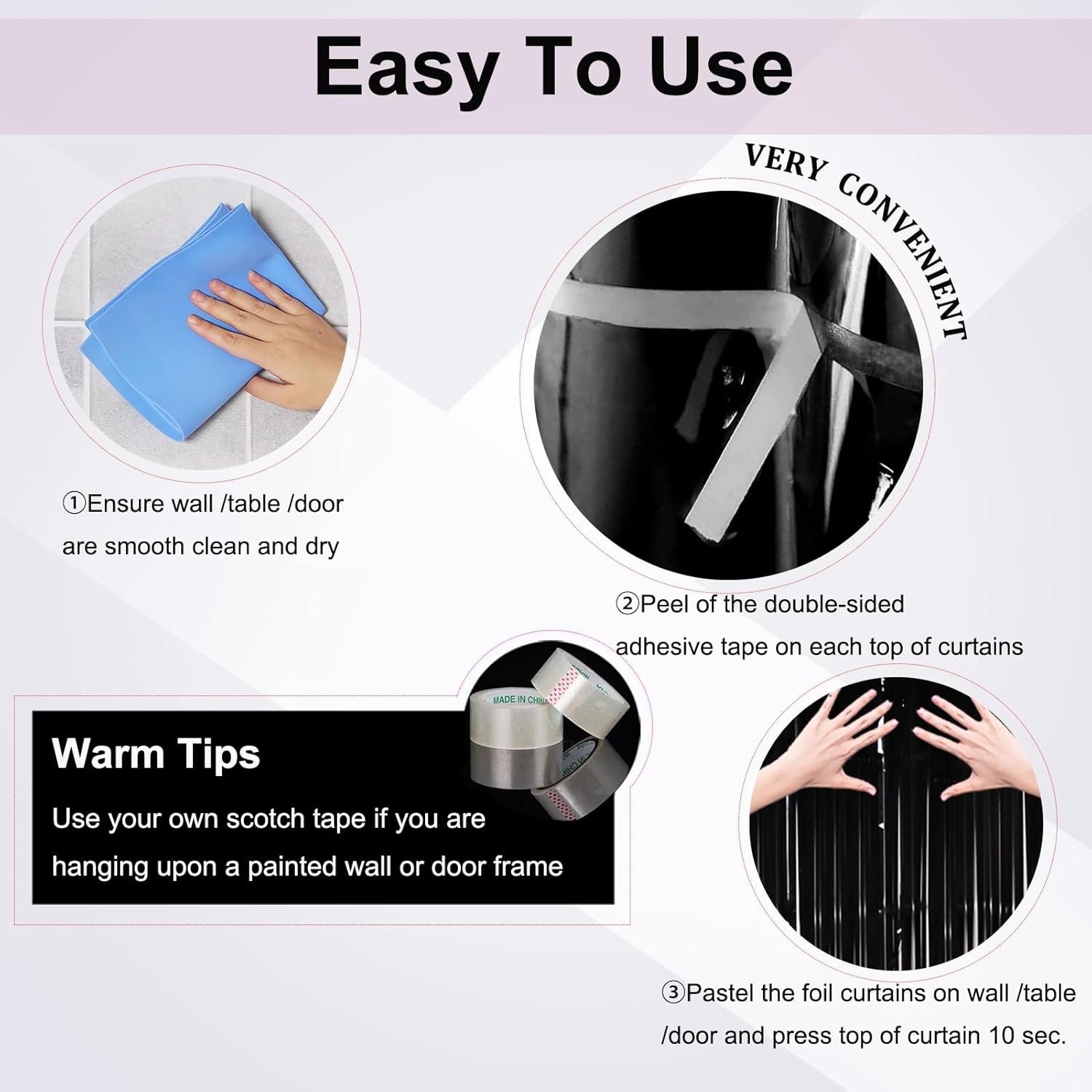 - š¤ćEASY TO USEćLet your home is no longer tedious,create warm atmosphere for your family. It only takes two steps--step1:Tear off the back of double-sided adhesive tape. step2: Paste the foil curtain on wall/door/table to decorate your party