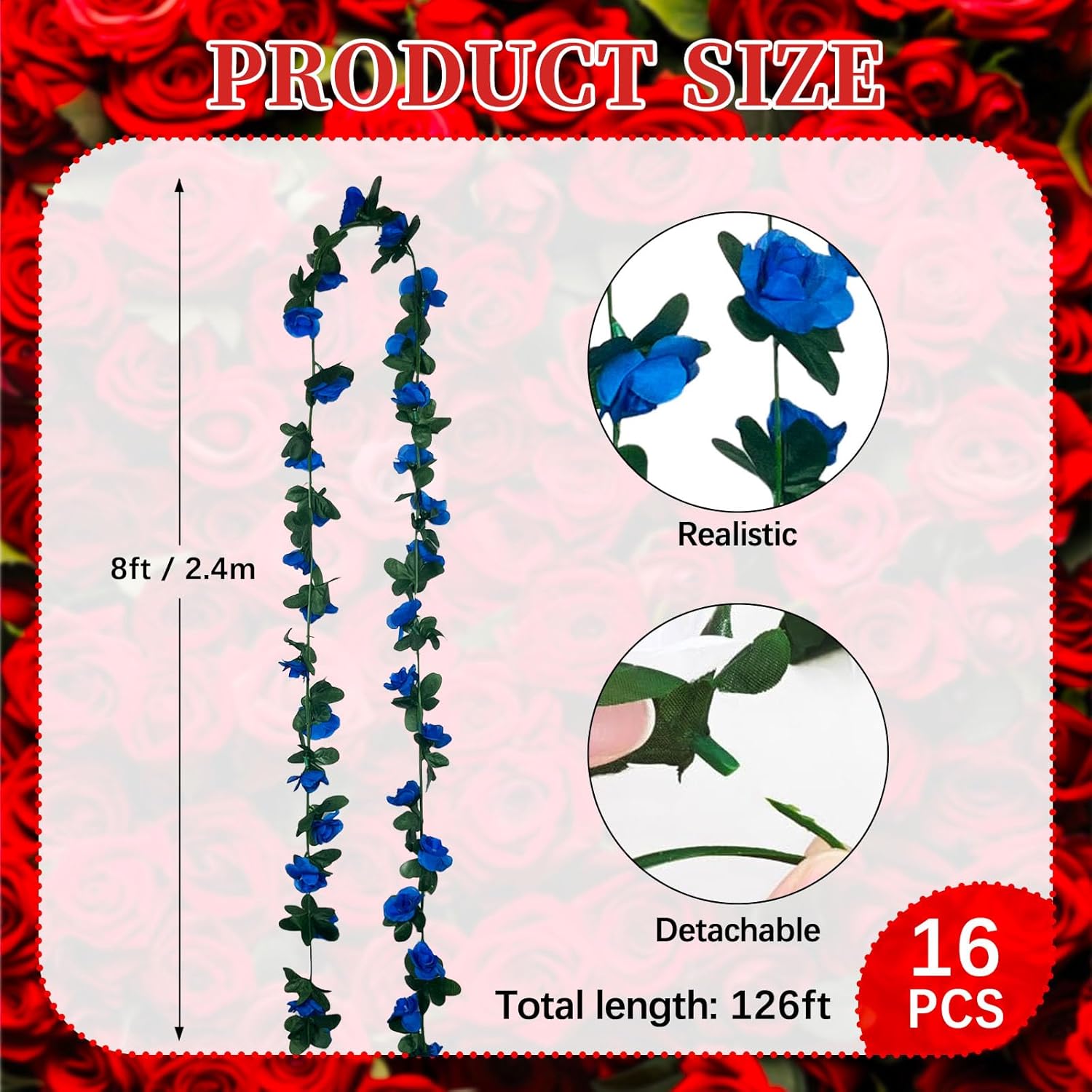 16Pcs 126Ft Royal Blue Rose Garland, Fake Rose Hanging Flowers, Artificial Flower Vine, Hanging Floral Vine Garland for Wedding, Birthday Party, Wall Arch, Halloween, Christmas Garden Backdrop Decor