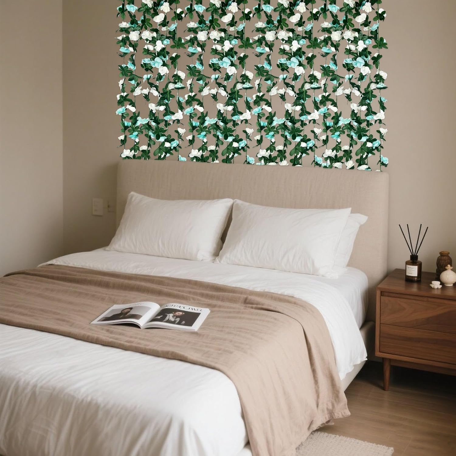 8Pcs 63Ft Teal&White Rose Garland, Fake Rose Hanging Flowers, Artificial Flower Vine, Hanging Floral Vine Garland for Wedding, Birthday Party, Wall Arch, Halloween, Christmas Garden Backdrop Decor