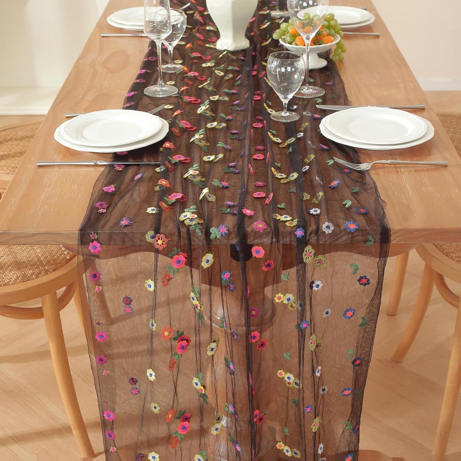 Black Embroidery Daisy Fall Table Runner 120Inch 10FT Florals Soft Sheer Tulle Fabric Table Runner for Home Decor, Brithday, Wedding, Baby Shower ,Holiday ,Parties, DIY Craft,3PC