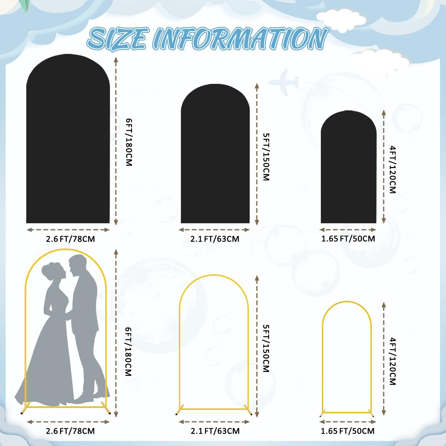 - đ§¸ăSize Information- Arch Backdrop Stand and Cover SetăArch stand and cover set includes 3 gold metal arch backdrop stands and 3 black arch cover in sizes 6FT x 2.6FT(H x W), 5FT x 2.1FT(H x W) and 4FT x 1.65FT(H x W). The backdrop arch stand with cover is certain to meet your decoration needs and add a charming look to your celebrations.