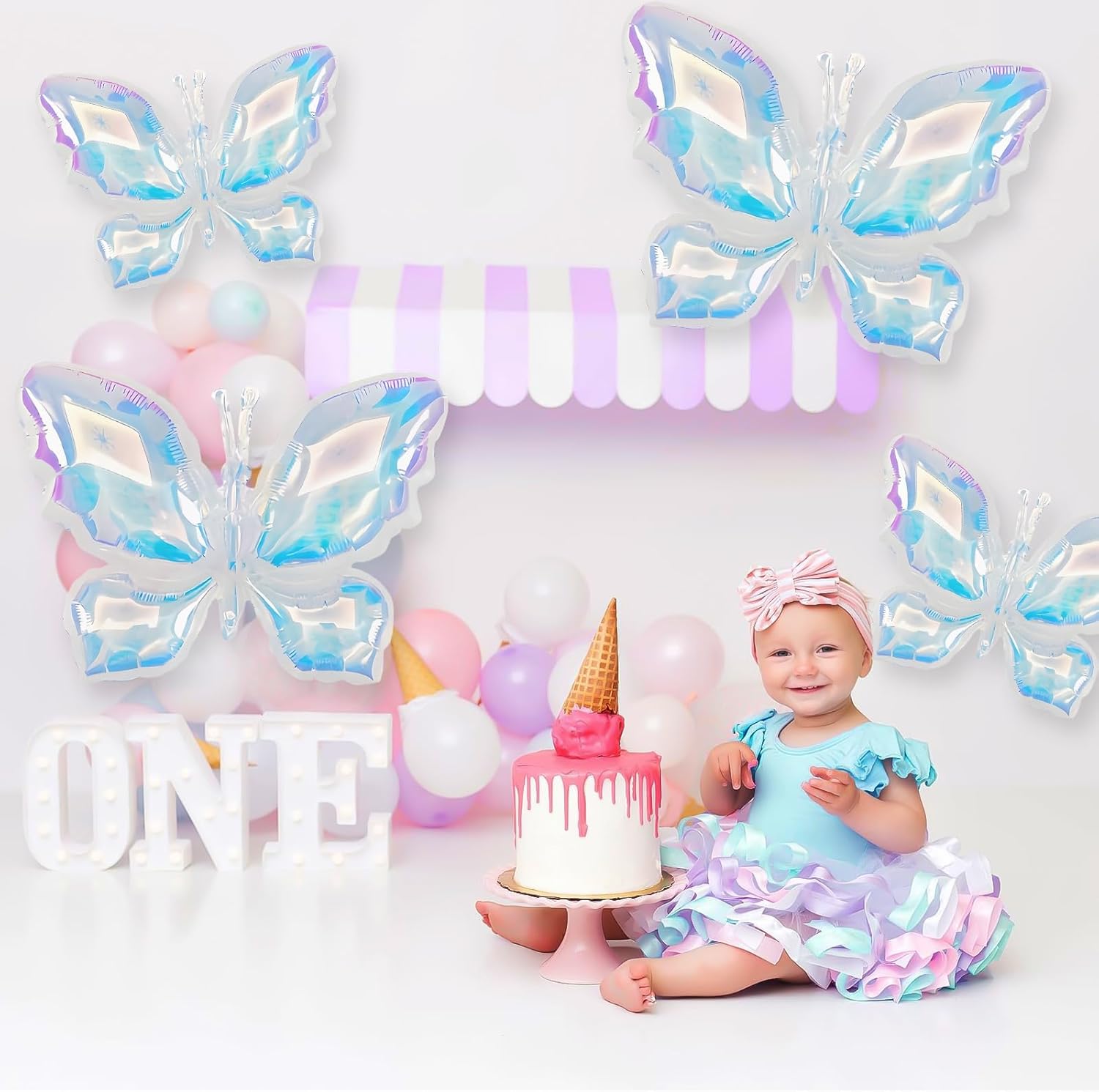 4Pcs Iridescent Foil Balloons, Iridescent Butterfly Foil Balloons, Rainbow Butterfly Holographic Clear Foil Balloon for Birthday Baby Shower Mermaid Rainbow Wedding Party Decorations