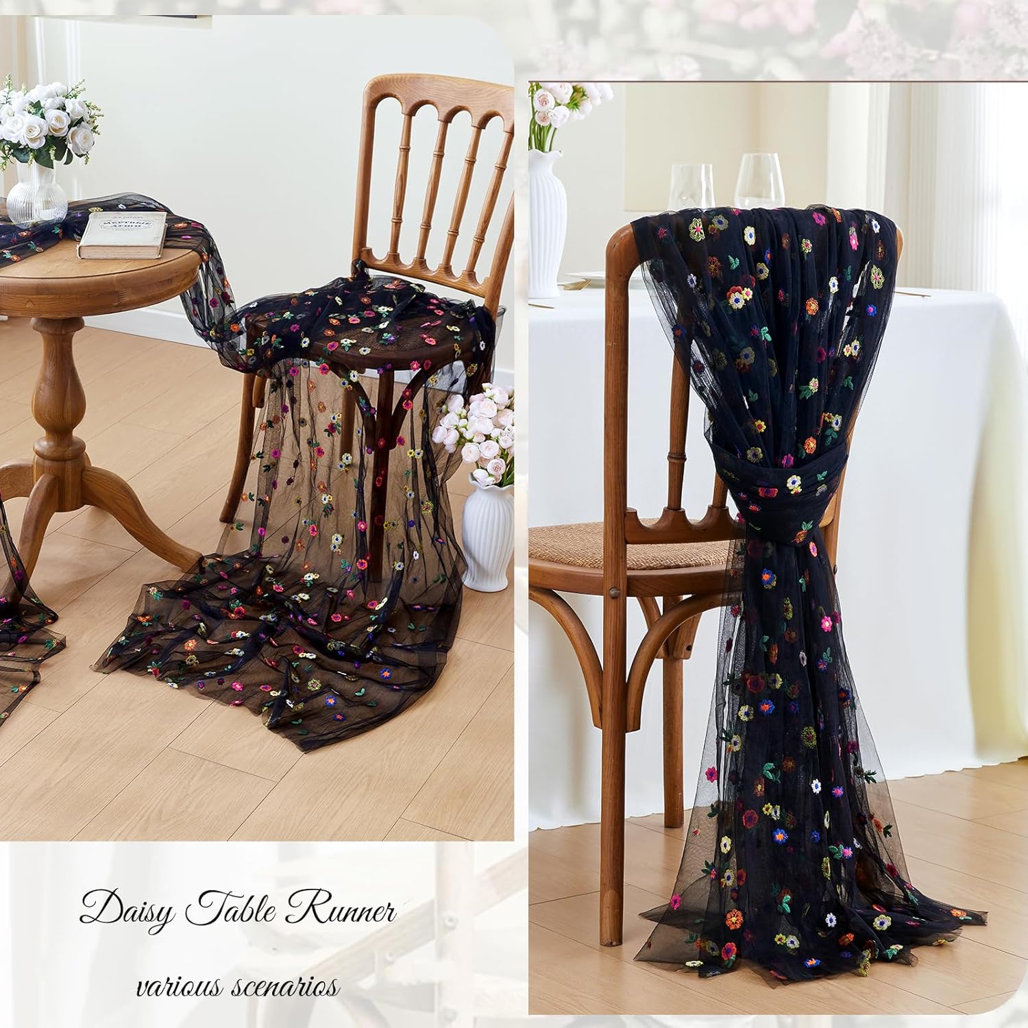 JIALE 3 Pack Black Floral Table Runner, Embroidery Daisy Seasonal Table Decorations, 120Inch 10FT Tulle Fabric for Home Decor, Bridal Shower Wedding, Baby Shower Parties, DIY Craft