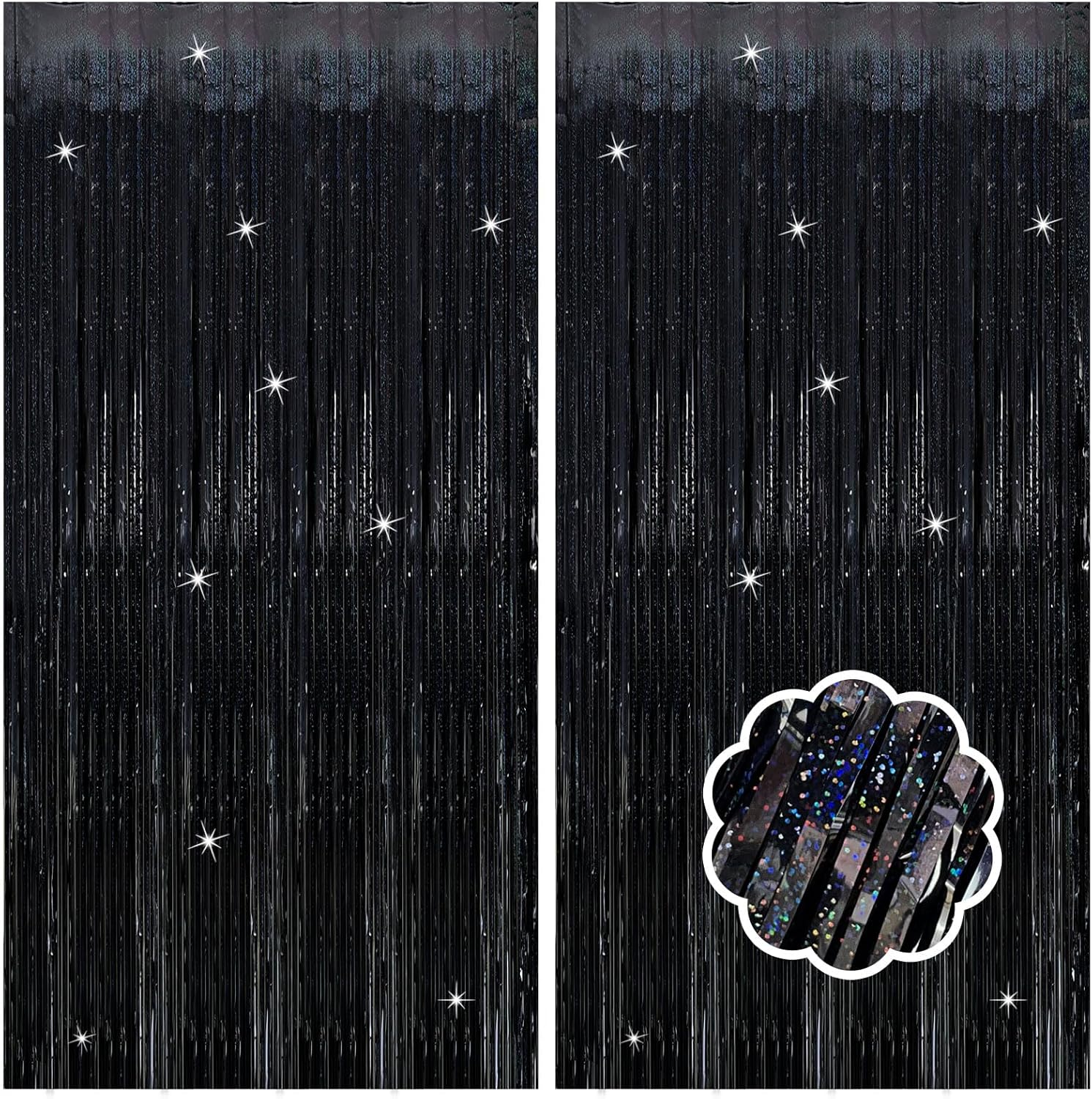 2 Pack Black Foil Fringe Curtain Backdrop Black Streamers Tinsel Backdrop Halloween Party Decor Birthday Wednesday Graduation Wizard Party Decorations for Men