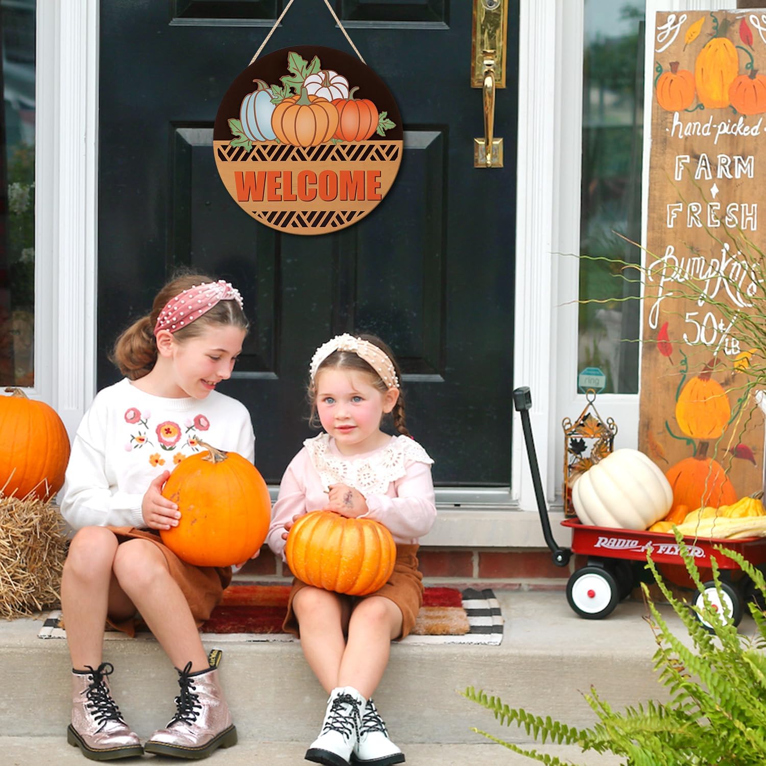 CHDITB Fall Pumpkin Welcome Front Door Sign Wreath(12"x12"), Wooden 3D Hello Fall Autumn Decoration Wall Hanging, Farmhouse Vintage Welcome Home Decor Hanger for Porch Indoor Thanksgiving