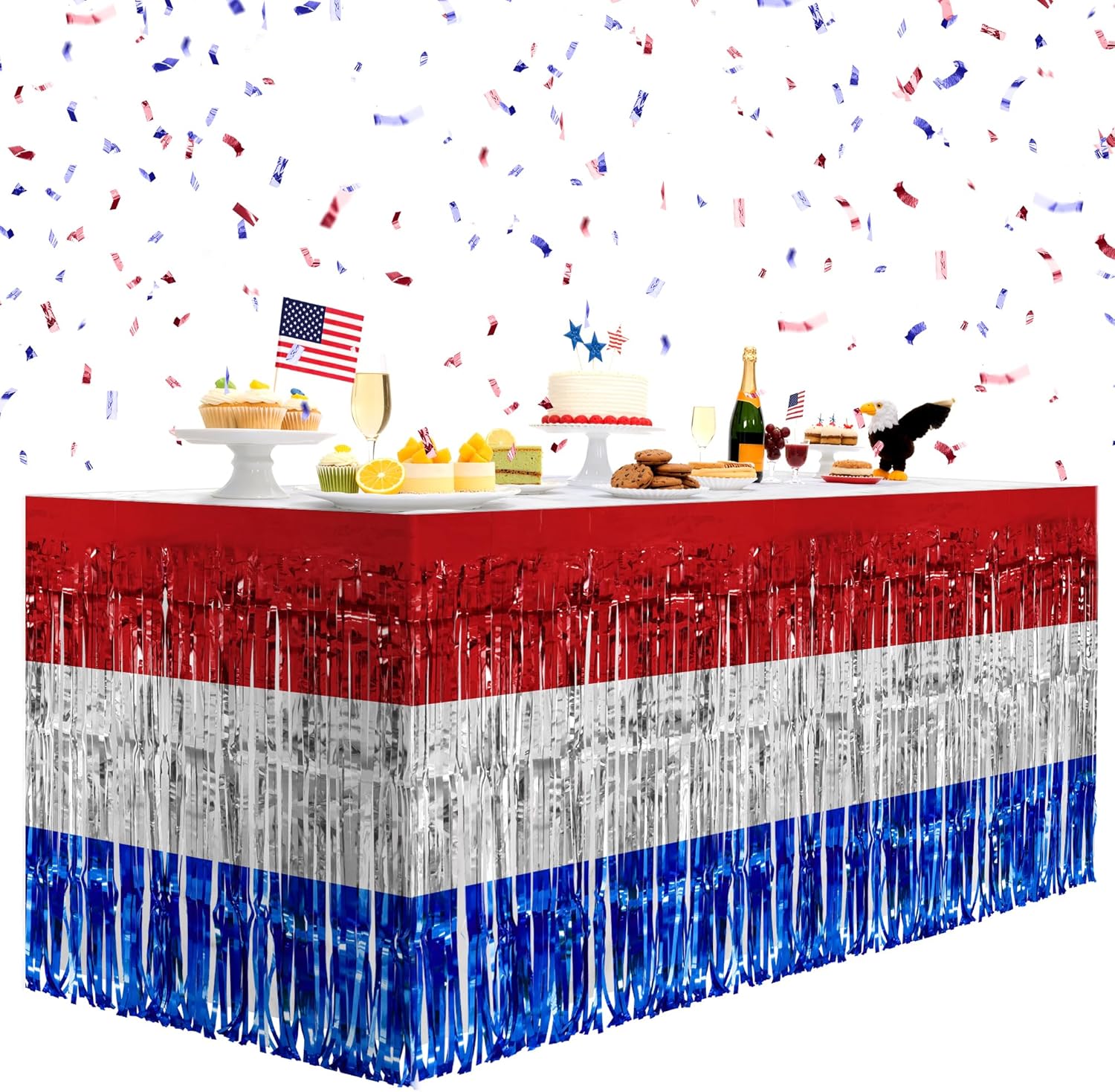 2 Pack Red&White&Blue Table Skirts, 29x108" Metallic Foil Tinsel Fringe Table Skirt for Rectangle Tables Streamer Curtains Backdrop, Party Decorations for Birthdays, Weddings, Holidays