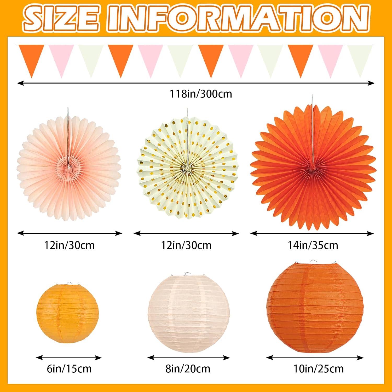 - 【Package】: This orange beige fal boho birthday party decorations set includes 9pcs paper lanterns in 3 sizes, 5pcs paper fans in 2 sizes. 1 pack of paper triangle flag banner. 15 pieces in total. The quantity and the size are enough to meet your decorative needs for daily or festivals.