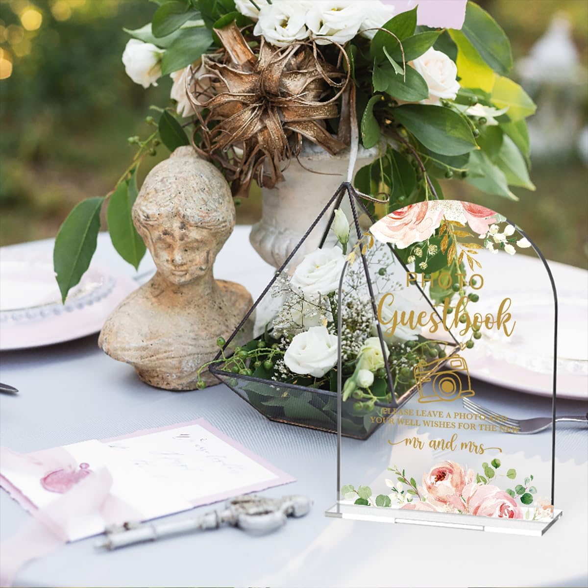 Acrylic Wedding Signs, Bridal Shower Decorations, Photo Guestbook Signs for Reception, Modern Calligraphy Arch Acrylic Table Top Sign for Wedding Reception and Engagement Parties (Clear Pink Flowers)