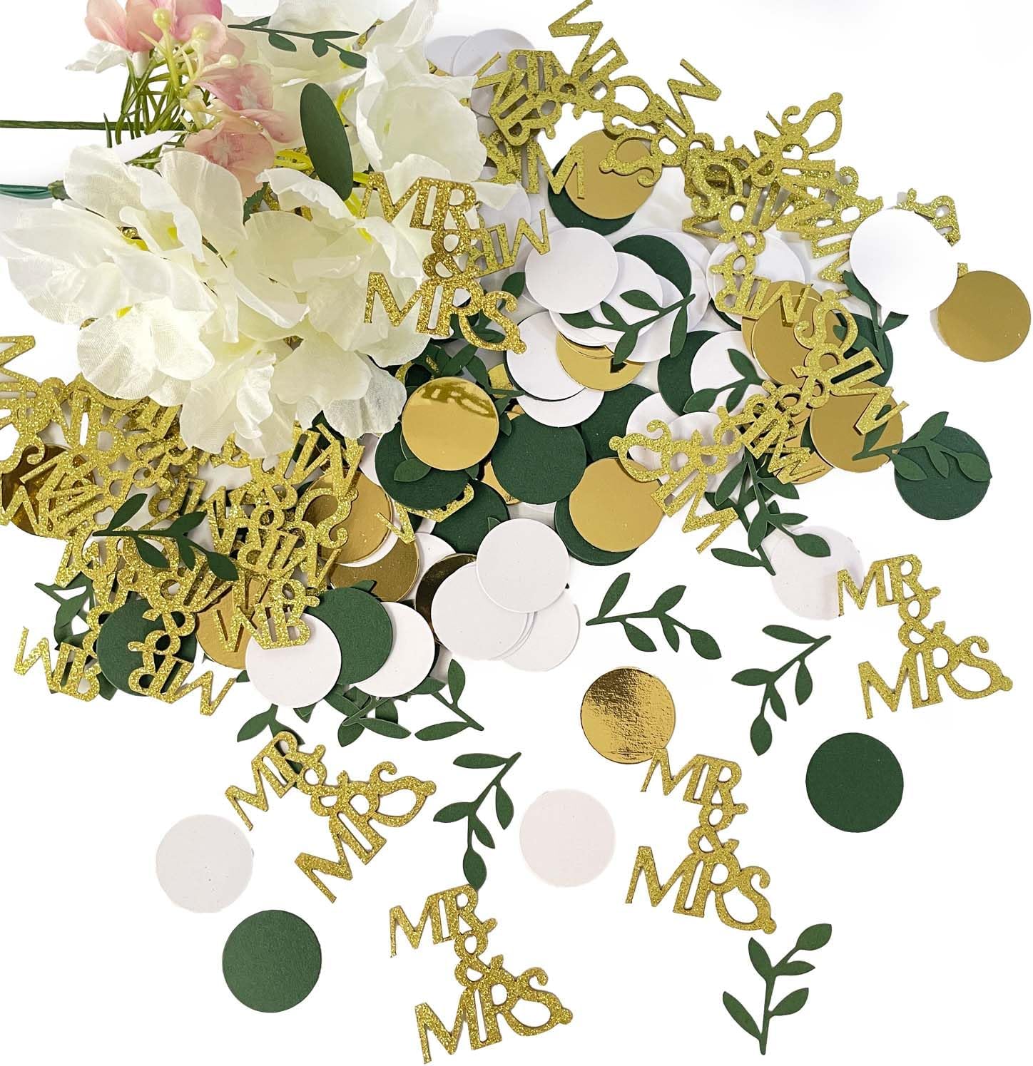 - PACKAGE INCLUDES-- gold glitter mr mrs table scatter, greenery Eucalyptus Confetti, gold conffeti dots, green confetti dots, White confetti dots