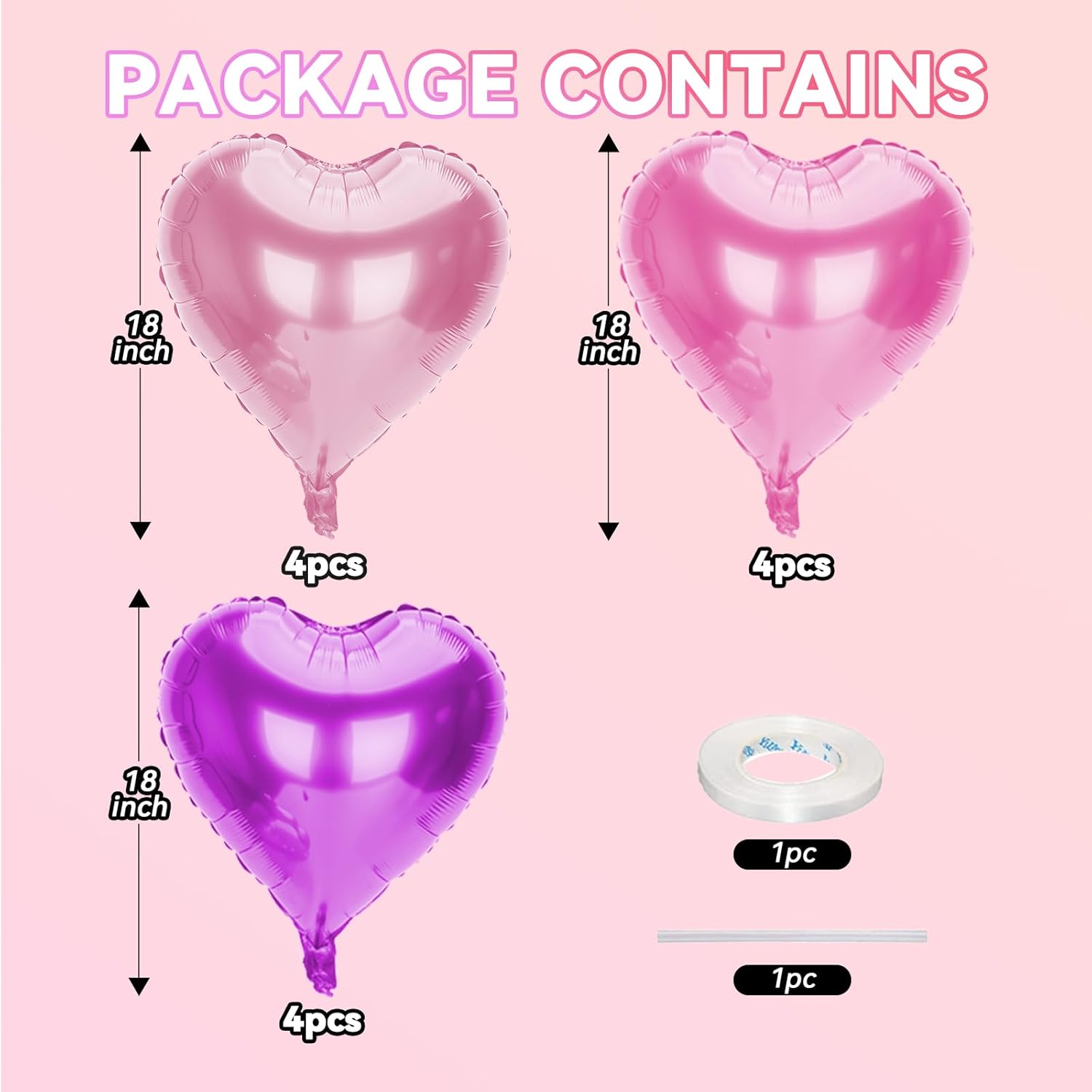 • Pink Heart Balloons:This 18 inches heart shaped balloons includes 4* hot pink heart balloons, 4* pearl pink heart balloons, 4* purple heart balloons, 1* ribbon, 1*straw, adding romance and warmth to your celebration. These large heart balloons will be the highlight of your party decorations, creating an atmosphere of love for everyone.