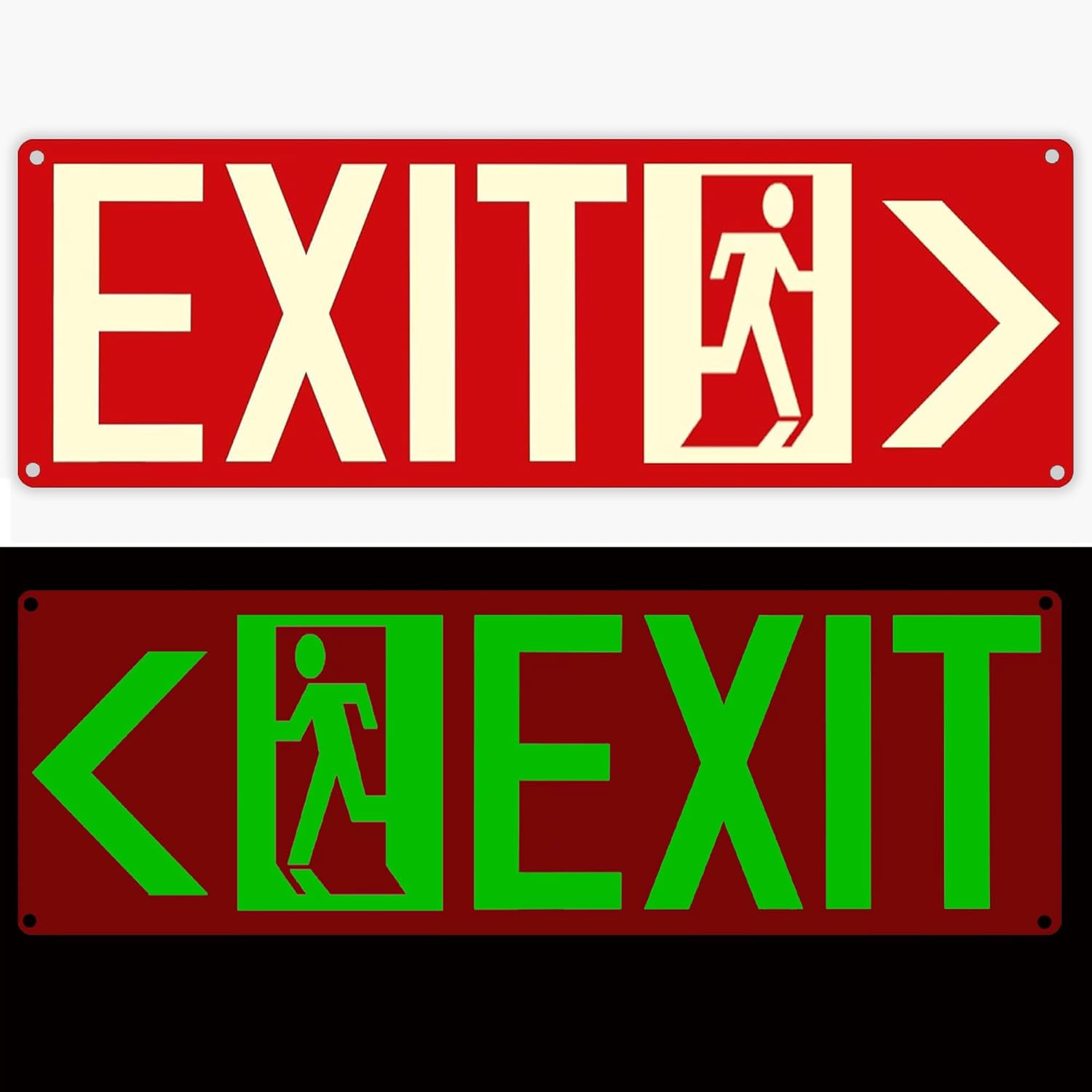 Photoluminescent Exit Signs, 14x5 inches, Red with Glow in Dark Feature, Self-Adhesive Aluminum, Left and Right Arrow Set