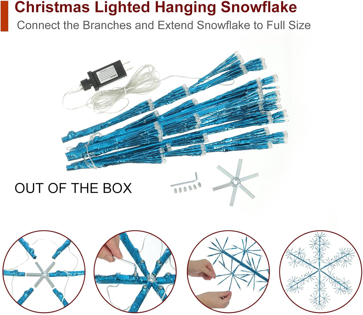 - Shape-able: It is flexible and shape-able, can be fanned out into a snowflake shape. Built-in handy hanging circular ring is easy for hanging in different scenes. UL-approved transformer for easy use throughout your home. Collapsible for easy storage