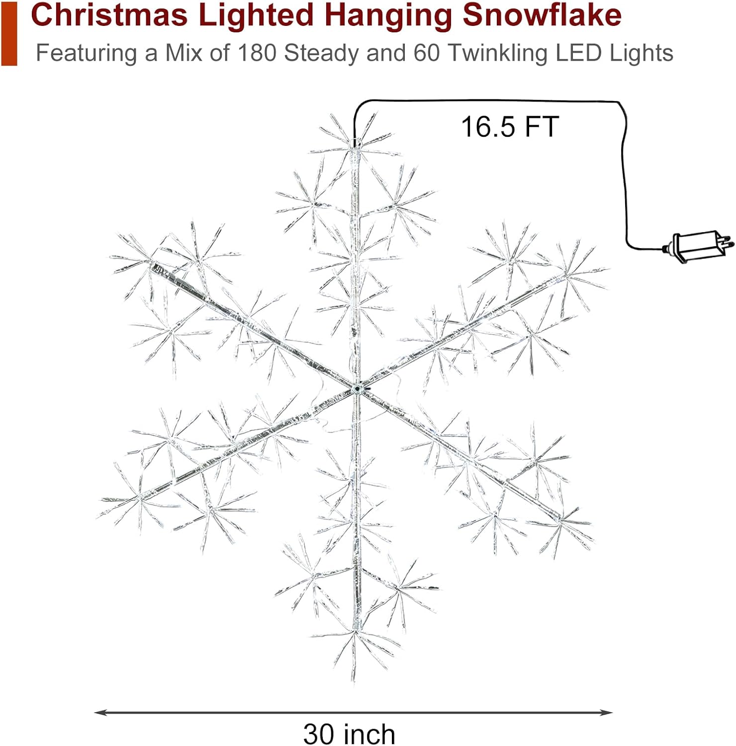 30’’ Christmas Snowflake Lights Outdoor, Pre-lit 240Pcs Cool White LEDs Hanging Silver Snowflake Decoration for Home Indoor Outdoor Window Silhouette