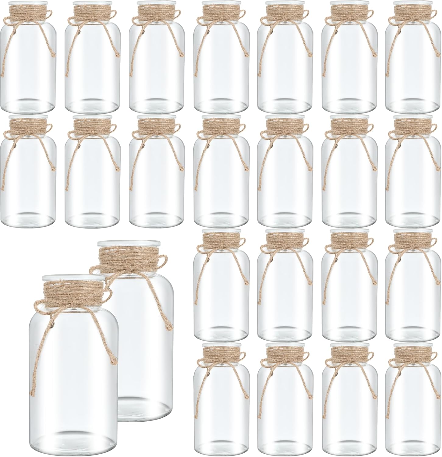- 🏺Package Included: a set of 24 glass vases. The central decorative size of each glass vase is 3.1 "diameter x 6.3" height, and the bottle mouth diameter is 2.28 inches. Equipped with simple hemp rope, it has a clear and retro appearance and an elegant design, and can be used to decorate different flowers