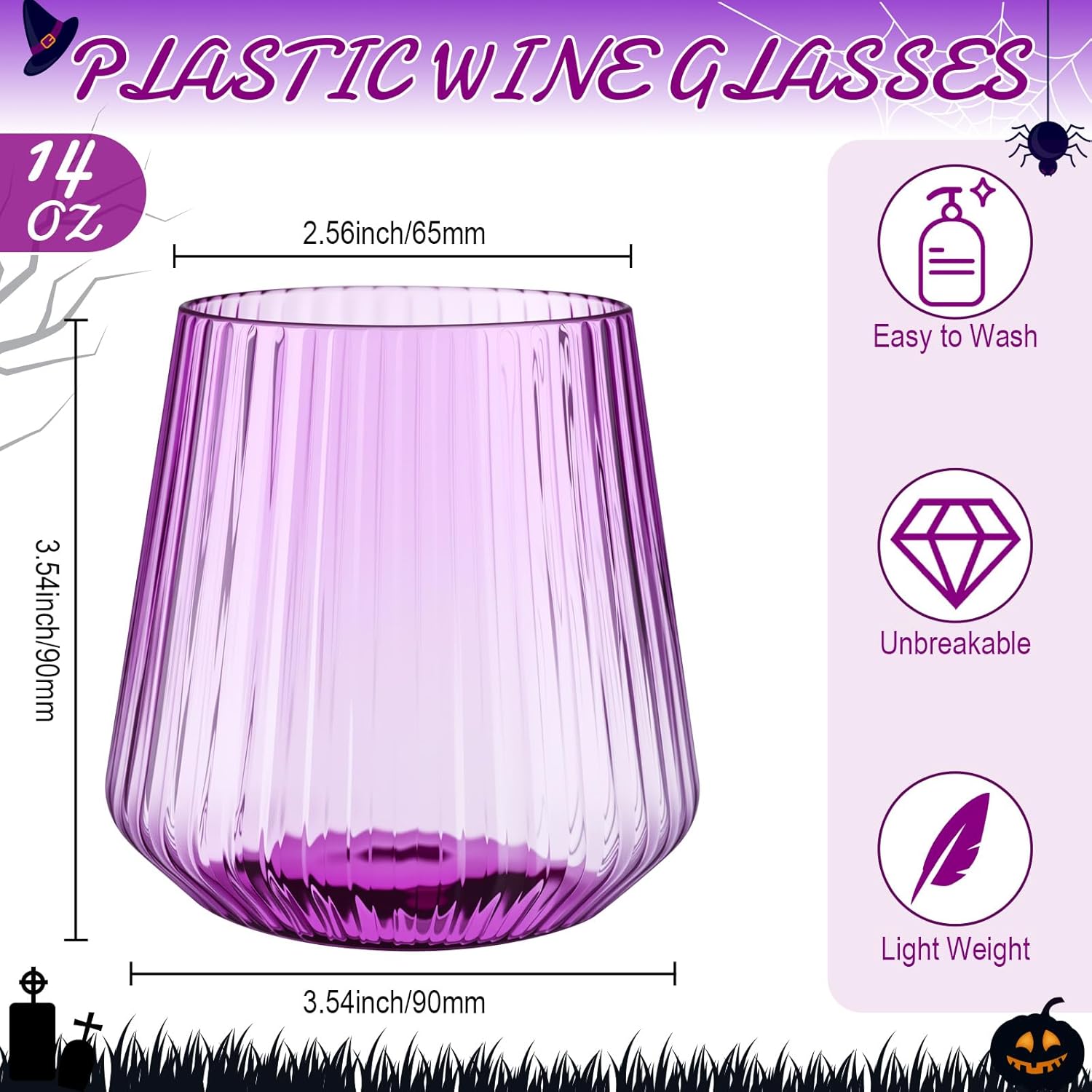 Suclain 50 Pcs Plastic Wine Glasses Ribbed Stemless Wine Glasses 14oz Vertical Design Unbreakable Cups for Outdoor Indoor Vintage Elegant Champagne Whiskey Cups for Party Wedding (Purple)