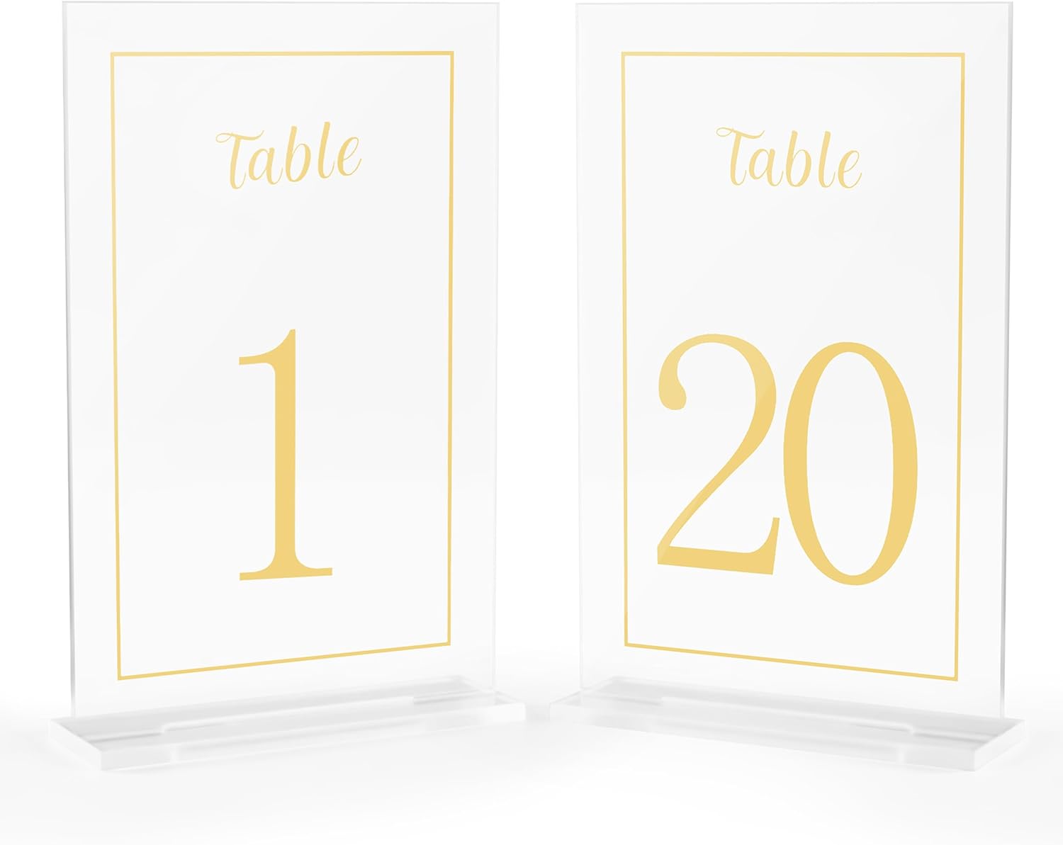 - [PACKAGE INCLUDES] Our acrylic table number package includes a pack of 20 stands with printed table numbers signs from 1 to 20. A perfect addition to your event and organization essentials with a timeless centerpiece decoration.