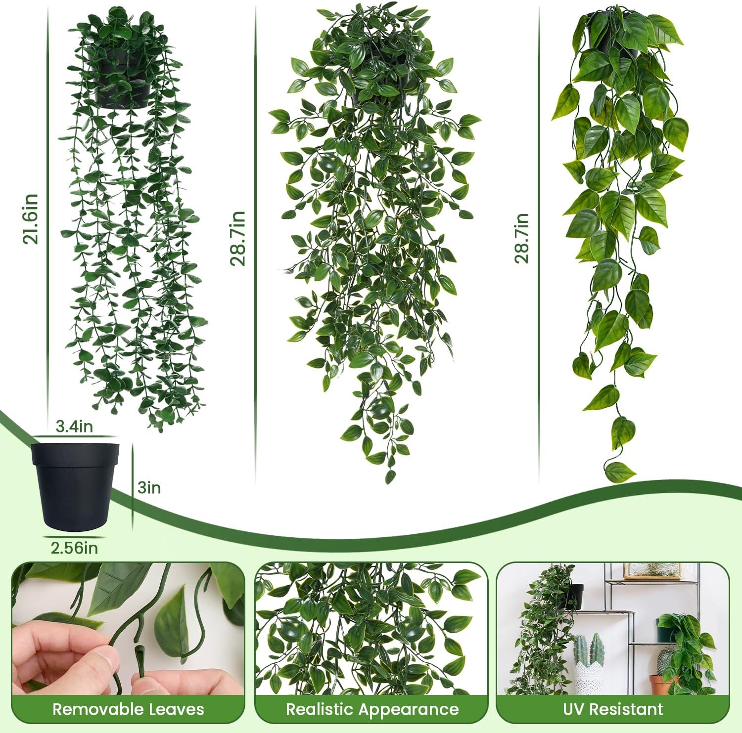 - Ideal Size & Easy Setup: Each hanging faux plant comes in a compact pot (approx. 3" H x 3.4" W). This set includes 3 kinds of hanging plants : pothos & mandala vines (both length is 28.5"), eucalyptus vine (length:21.5") The flexible stems can be gently adjusted for your desired shape. Note: Leaves may be slightly compressed during shipping — simply fluff them out to restore fullness
