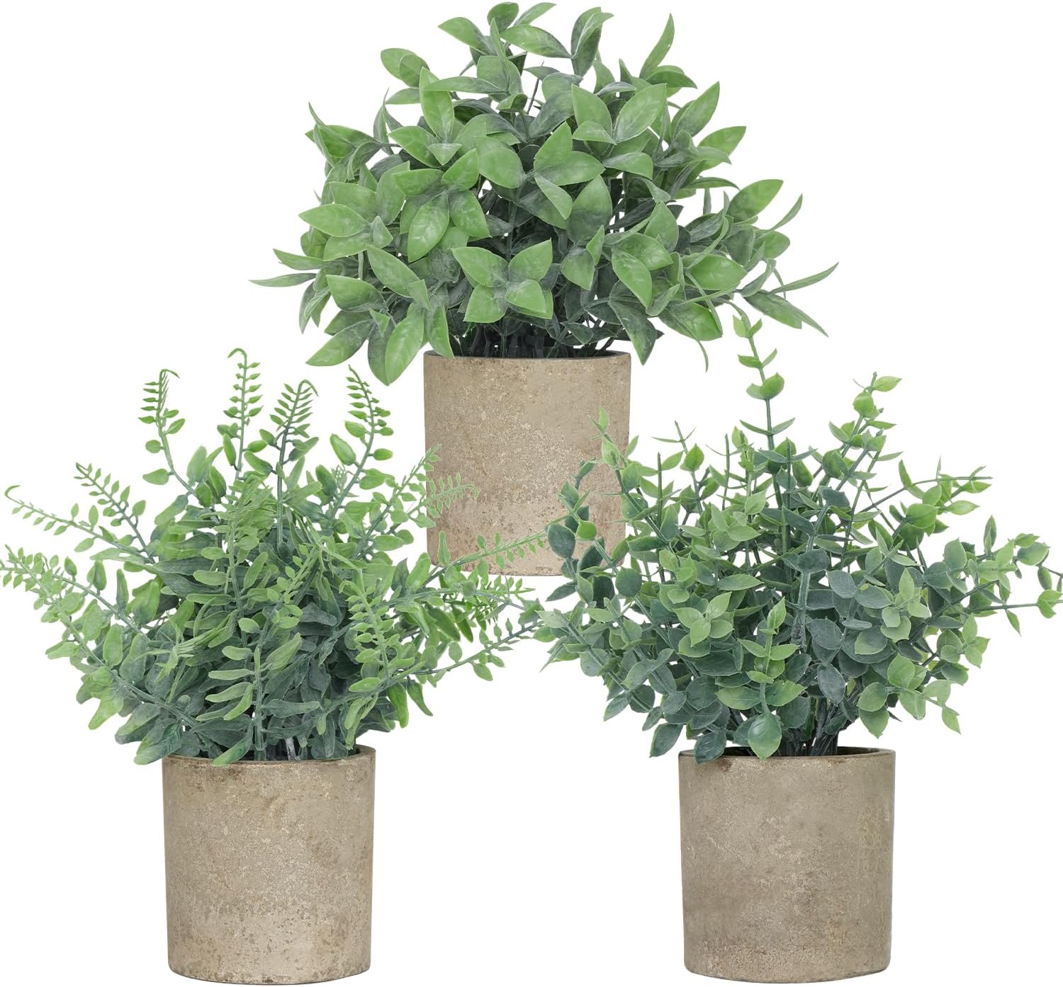 3 Pack Small Fake Plants, Artificial Eucalyptus, Boston Fern & Boxwood Leaves with Gray Paper Pulp Pots, Small Potted Faux Greenery for Home Decor, Bathroom, Shelf, Indoor&Outdoor Decoration