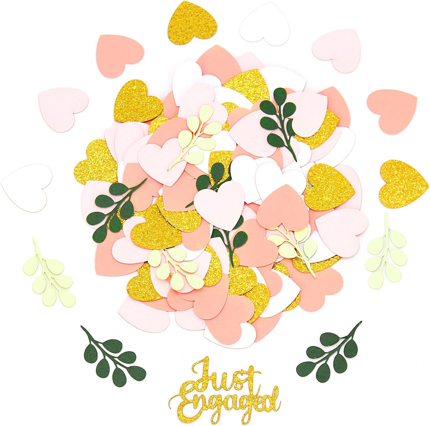 - 1.Elegant Color and Design-Great engagement party decor.The engagement confetti for tables match the sage green and pink gold white heart and greenery eucalyptus leaf with special gold glitter “just engaged” letters, which will show the unique visual impact and make the whole party warm and energetic.