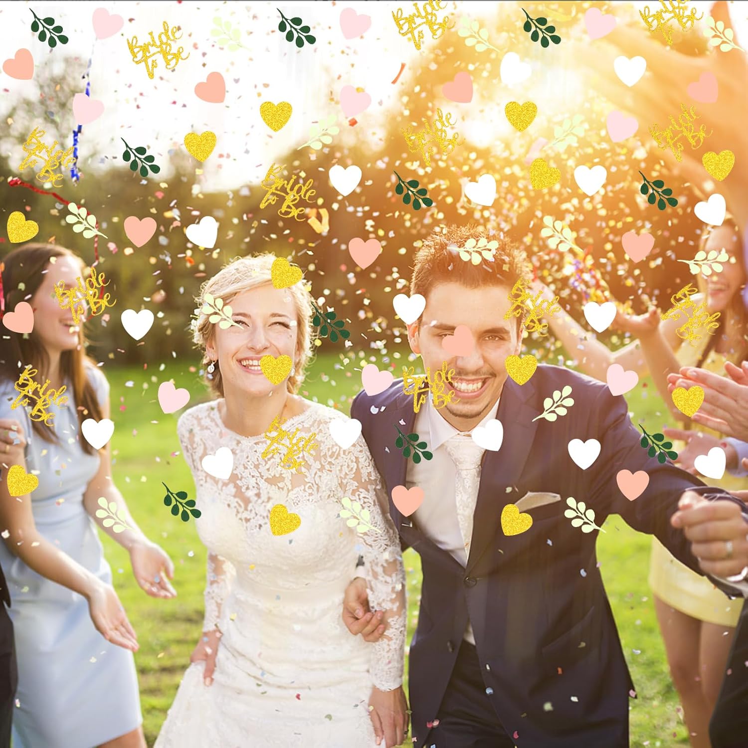 - 1.Elegant Color and Design-Great bachelorette party decorations.The bridal shower confetti for tables combined the sage green and pink gold white heart and greenery eucalyptus leaf with special gold glitter “bride to be” letters, which will show the unique visual impact and make the whole party warm and energetic.