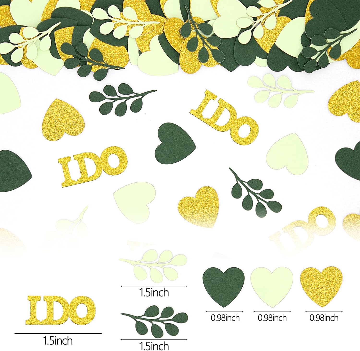 - 5.Proper Size and Premium Material.The heart confettis width 0.98inch,the sage leaves 1.5inch width,the I do letter 1.5inch width,looks perfect with premium fresh color papercard,adding a warm and energetic sense to your party table decorations.