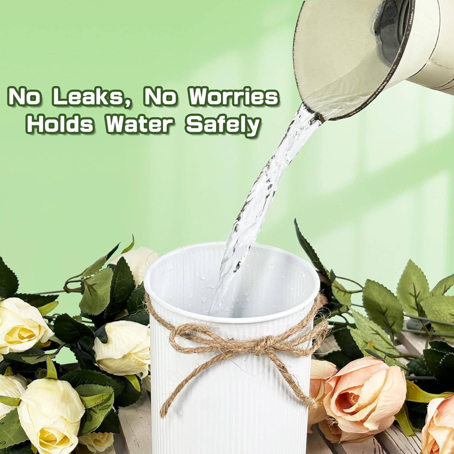 6" High Farmhouse Vases for Centerpiece, Rustic Mason Jars with Twine Bow for Flowers, Vintage Galvanized Metal Vase Tin Bucket for Wedding Home Decor (White, 6Pcs)
