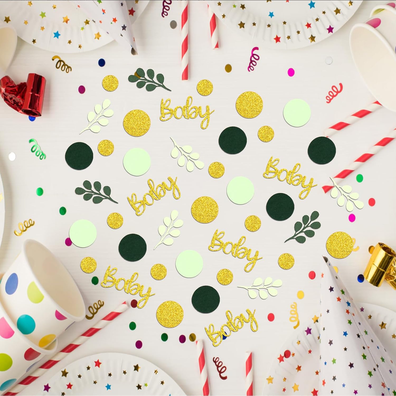 - 4.Proper size and quality material.The circle dot confetti(0.98inch),sage leaf(1.5inch)scatters,baby letter (2inch),perfect propotion and sturdy premium paper card,great for baby shower table decor.