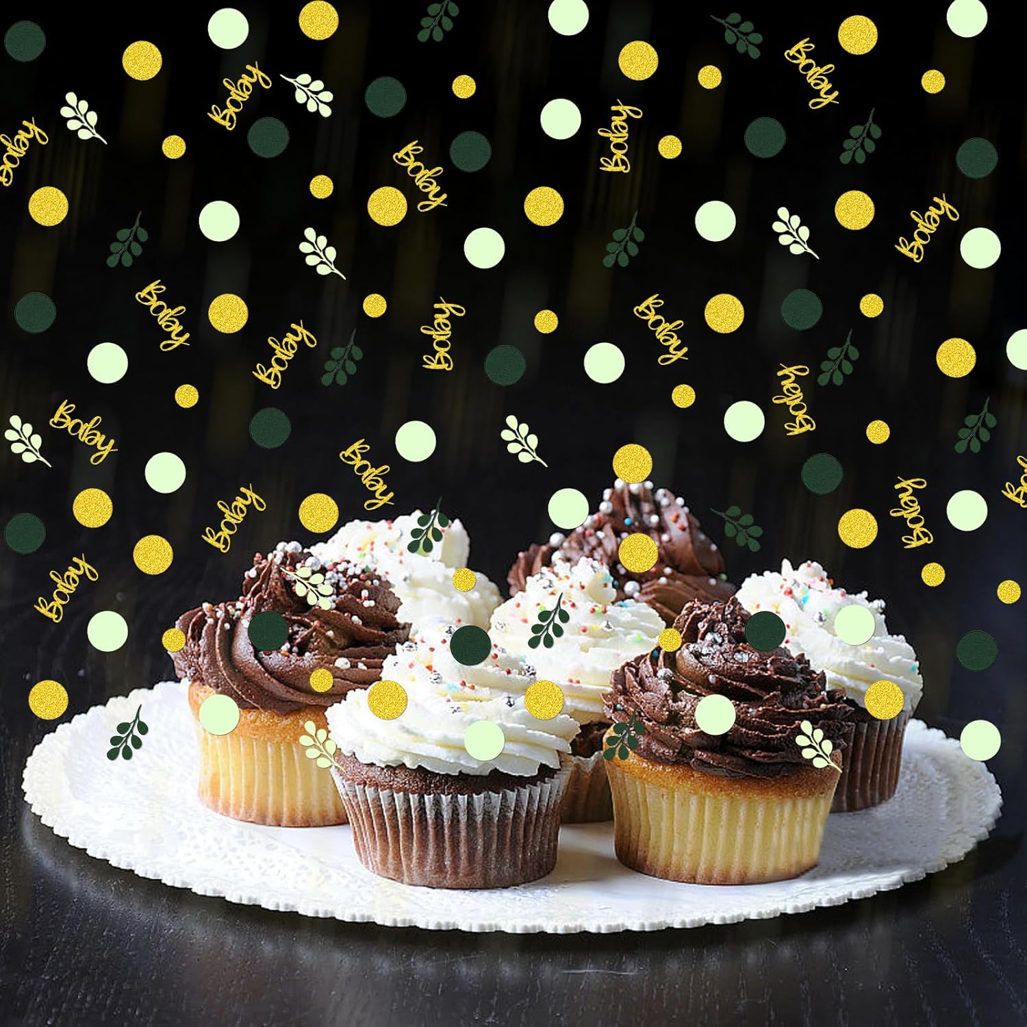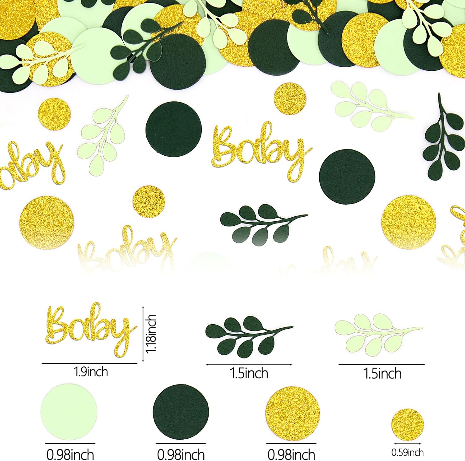 - 1.The greenery baby shower confetti package include:300pcs total,there are 3designs round circles sage leaves and “baby” letters in 3 colors(glitter gold/light green/dark green/),looks fresh and full of vigor.