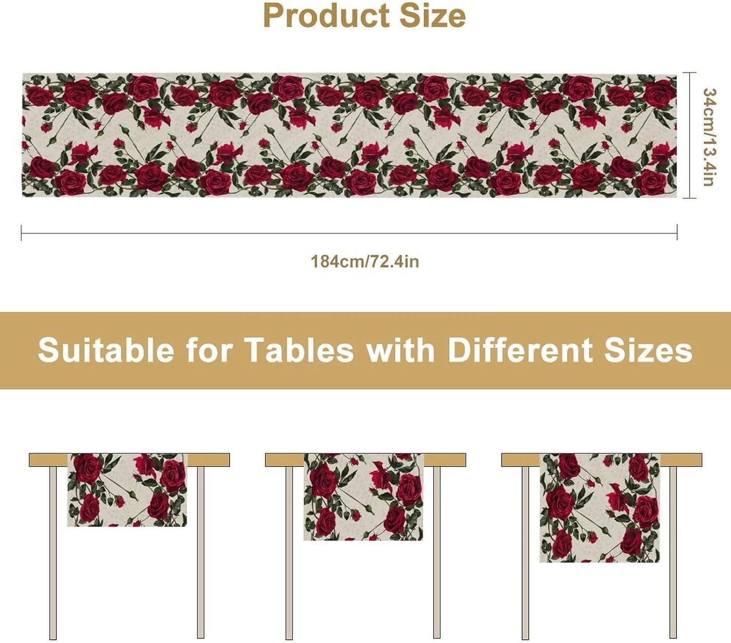 Rose Table Runner, Retro Red Rose Flowers Green Leaves Valentine's Day Kitchen Dinning Table Runner for Indoor Outdoor Home Wedding Party Holiday, 13x36 Inch