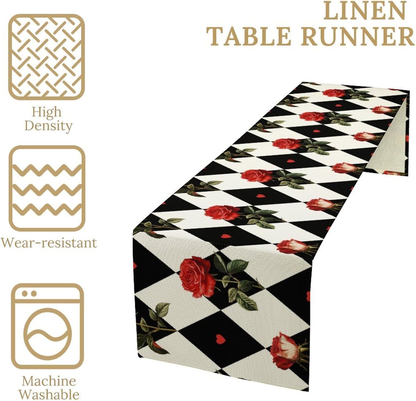 Vintage Rose Table Runner, Red Rose Hearts Black White Checkered Background Table Runner for Kitchen Dinning Table Runner Decor Home Wedding Party Holiday, 13x108 Inch