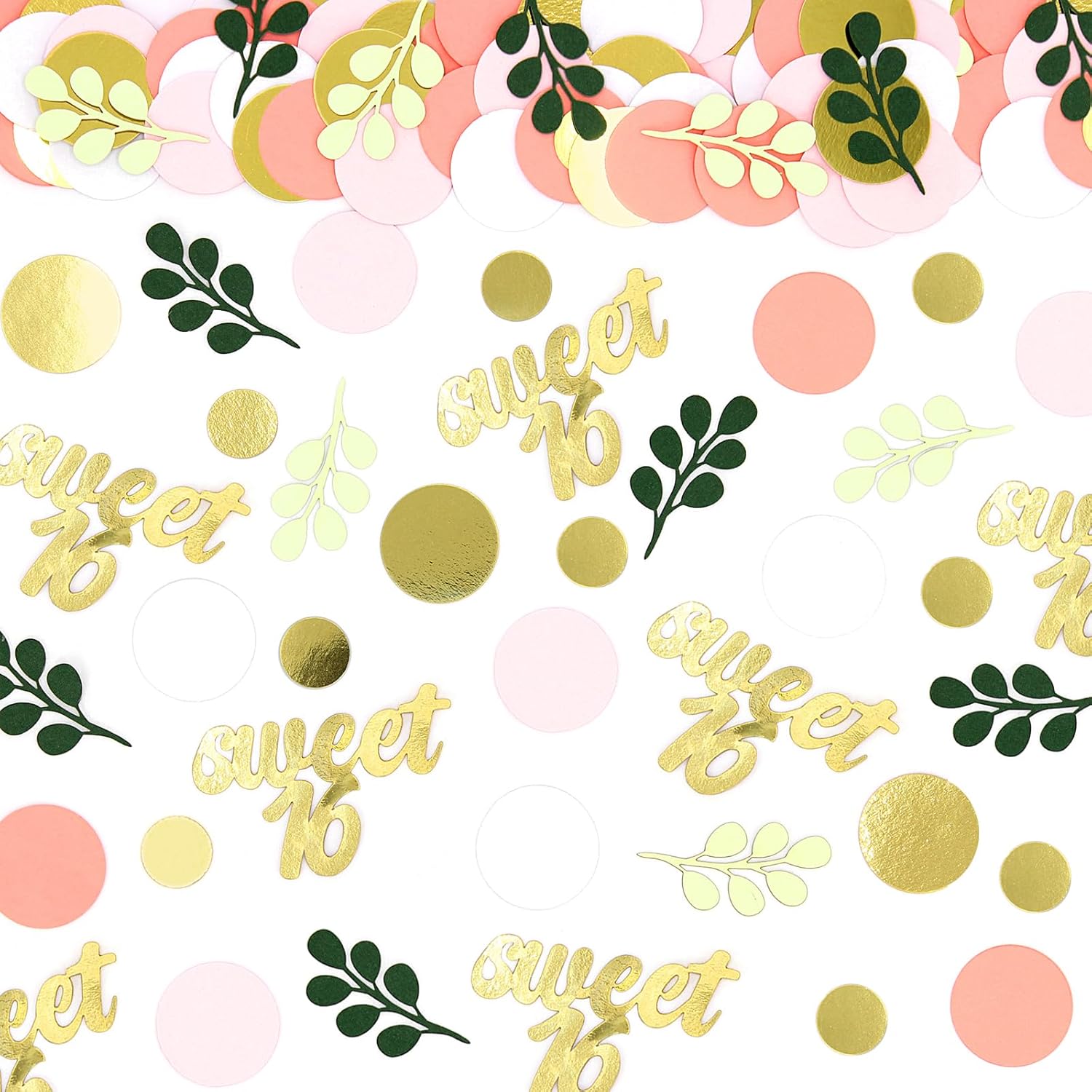 - 5.Proper size and premium quality.The lovely 16 birthday table scatters is with sturdy bright paper card,with nice size--big dot confetti 0.98inch small dot 0.59inch,sage leave 1.5inch sweet 16 letter 2inch,looks great as sweet sixteen party decorations to make your tables shine and bright up your party in your girl birthday era,celebrate with fun.