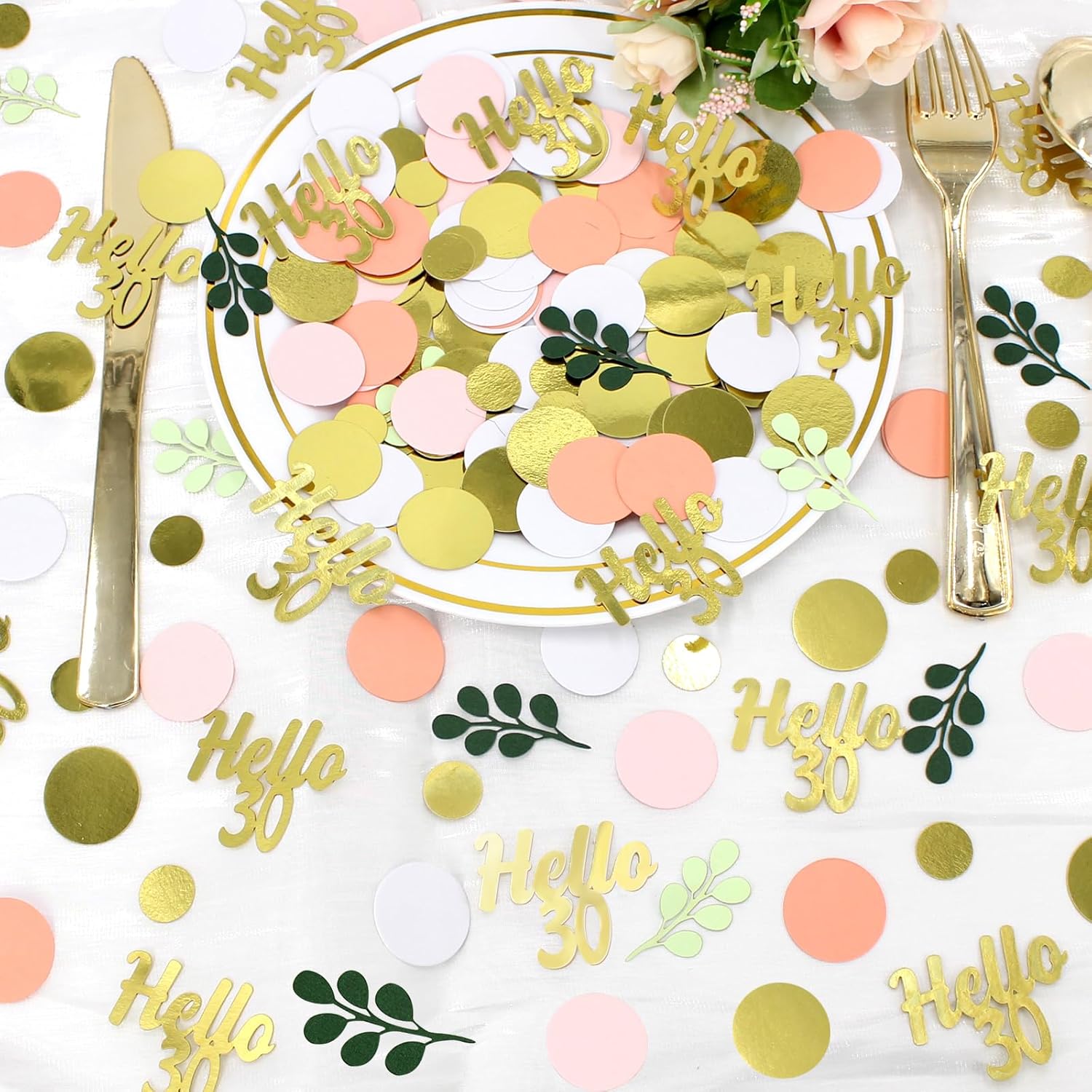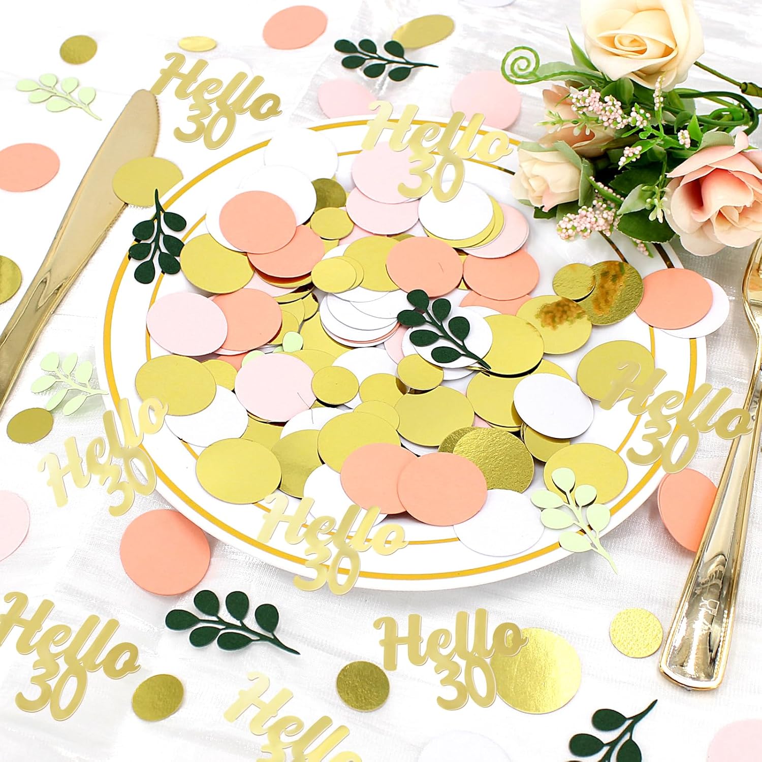 - 3.Charming Colors.The hello thirty birthday table confetti combined 6 colors(shiny gold foil paper/blush pink/peach pink/white/light green/dark green) ,the vibrant colors make the birthday table decor warm and full of vigor.